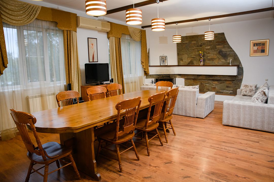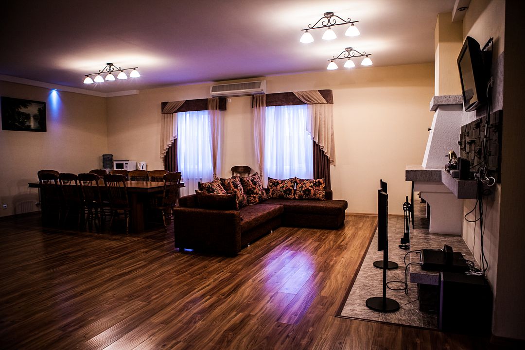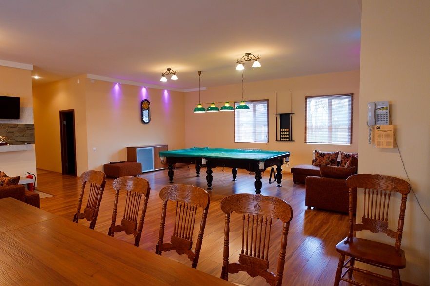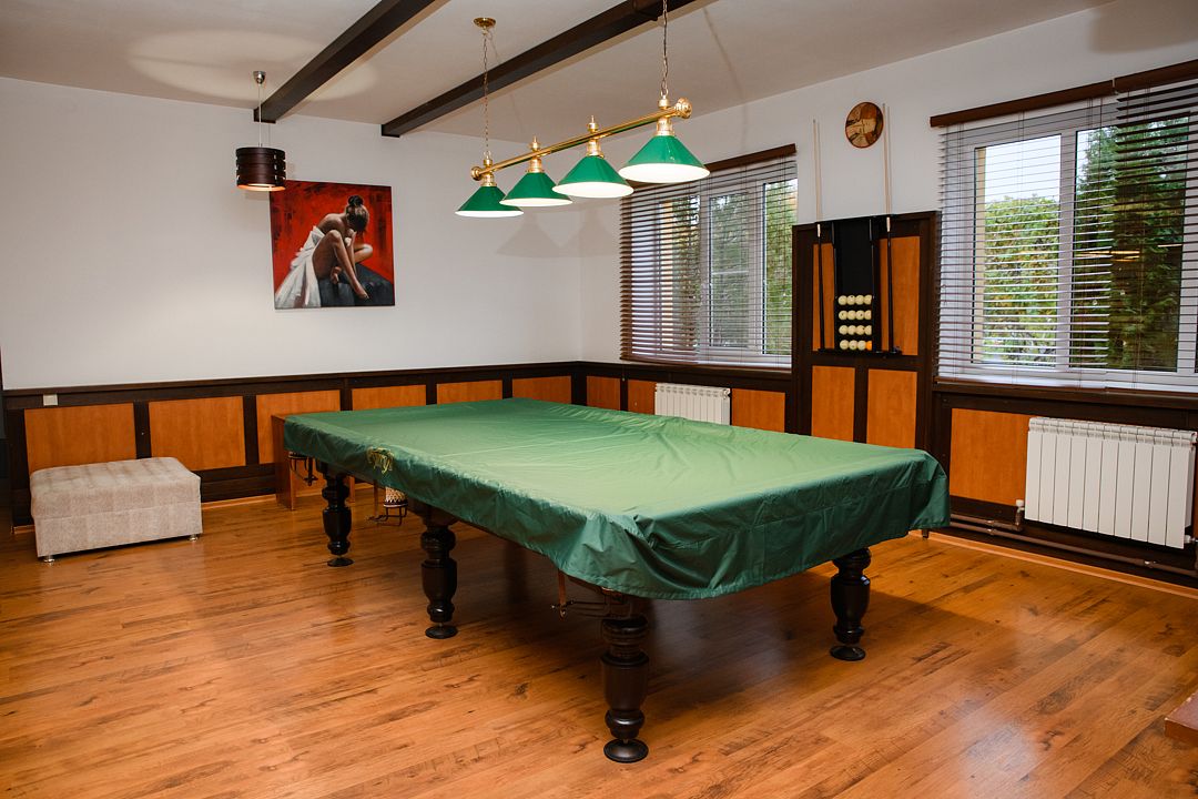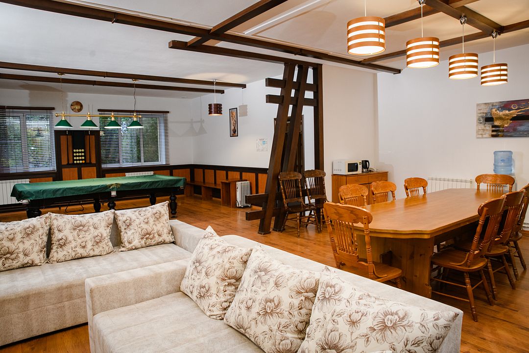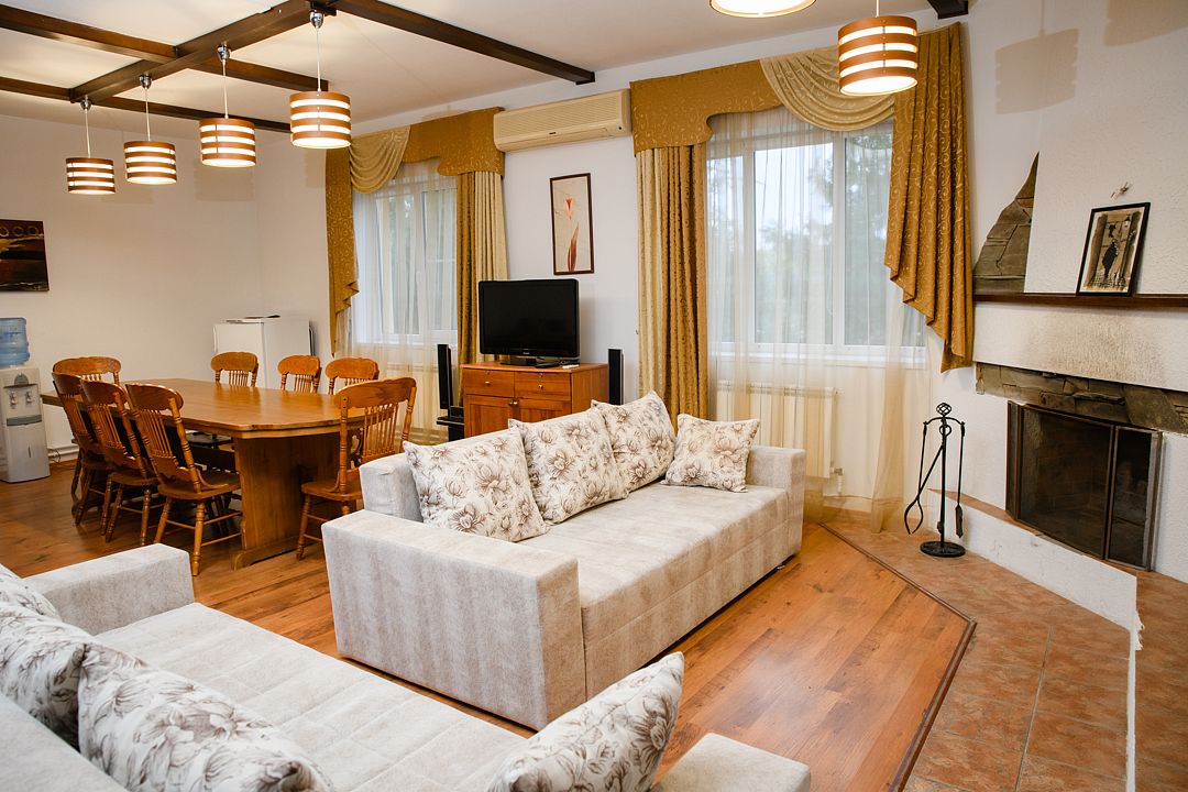Комфортабельный VIP дом с сауной, бассейном и уютной гостиной с камином и бильярдом. В доме две спальные комнаты с двуспальными кроватями. В каждой из них есть телевизор, сплит-система, платяной шкаф. В просторной гостиной мягкая мебель, большой банкетный стол, телевизор, микроволновая печь, холодильник, телефон. Здесь же установлен бильярдный стол. Атмосферу загородного отдыха и уюта создает камин. 2 ванные комнаты оборудованы душем, имеется гостевой санузел. Рядом с домом расположена беседка c мангалом.