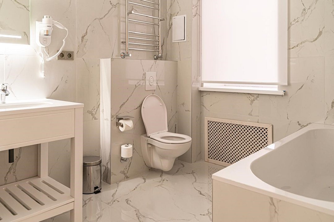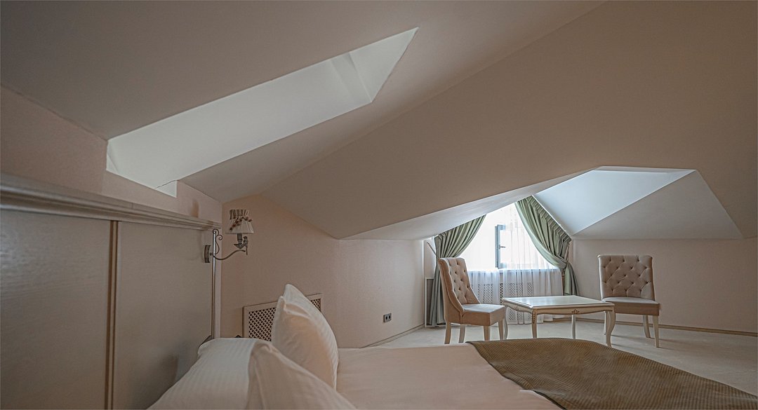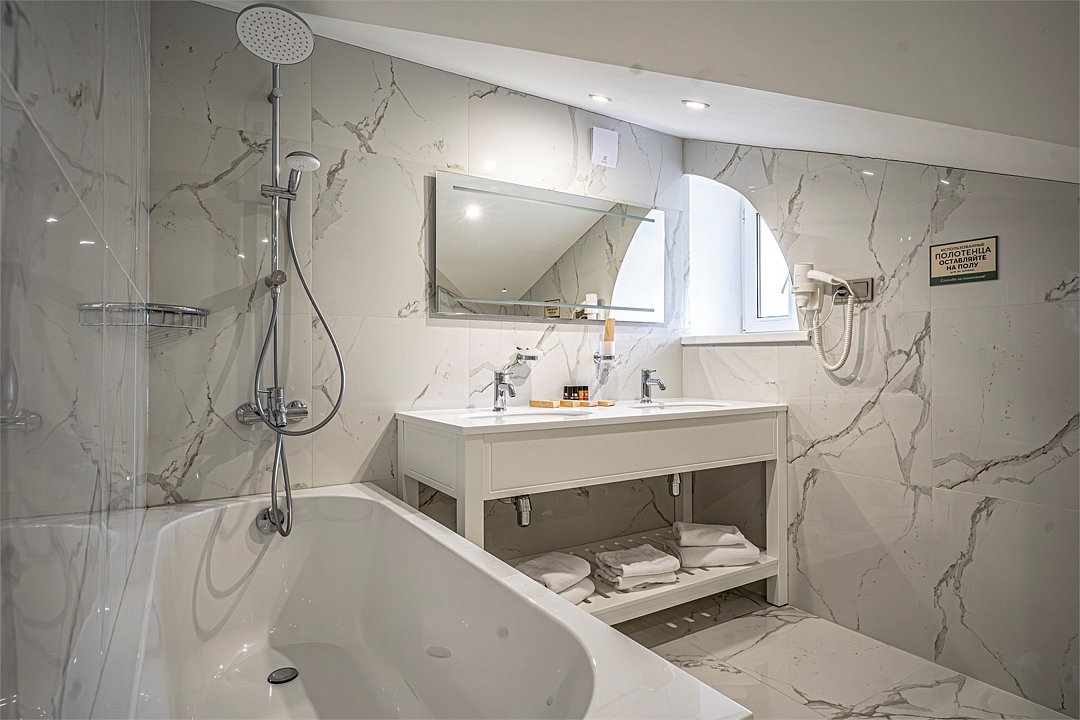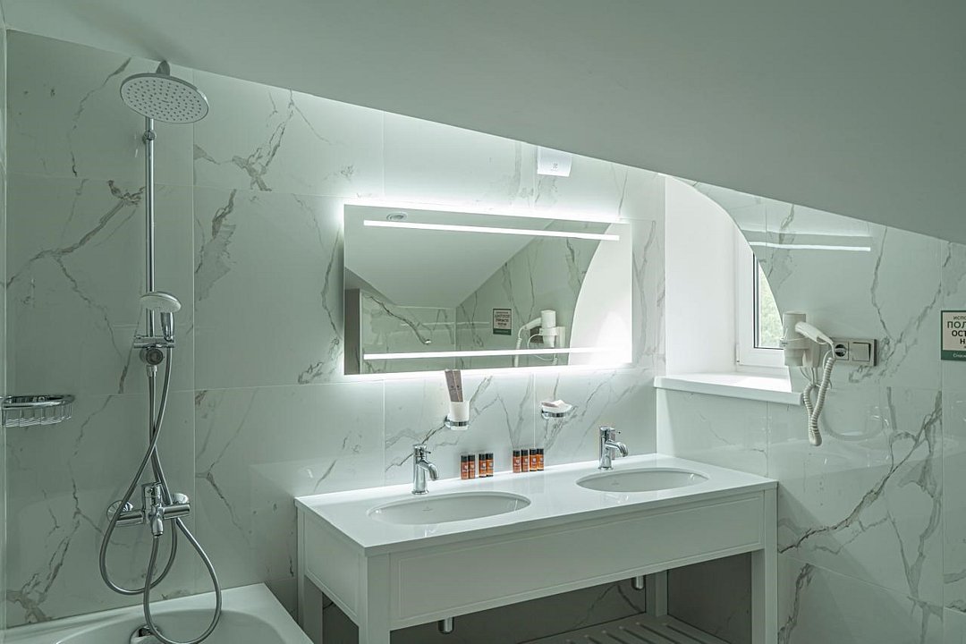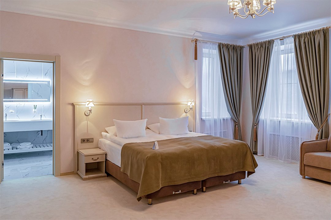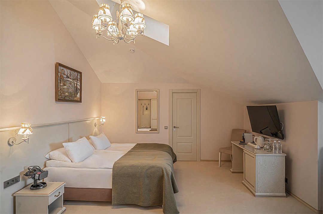 Номер площадью 30 кв. м с большой двуспальной кроватью, которая по запросу трансформируется в 2 односпальные. Номер оборудован просторной ванной.