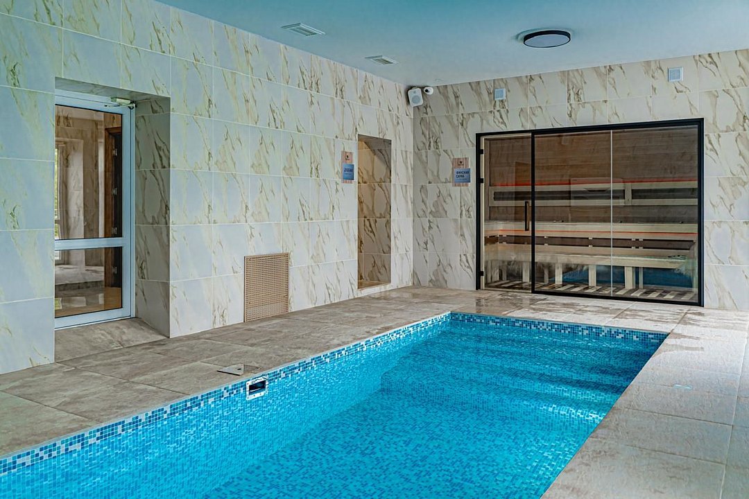 Крытый бассейн с системой противотоков площадью 19 кв. м. в сочетании с открытым бассейном 15 х 10 метров с водой из целебного источника. Финская парная с панорамной террасой.