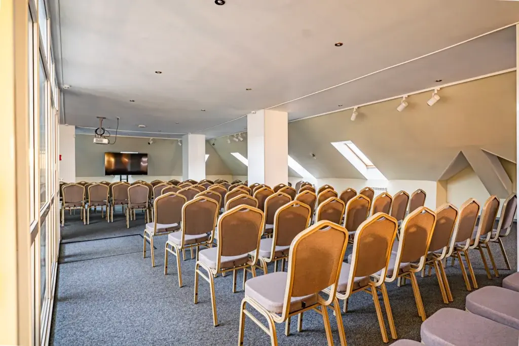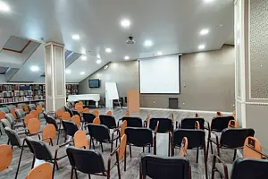 Просторный и светлый зал с дневным освещением оснащён всем необходимым оборудованием для небольших конференций и переговоров до 50 человек.
