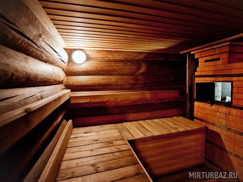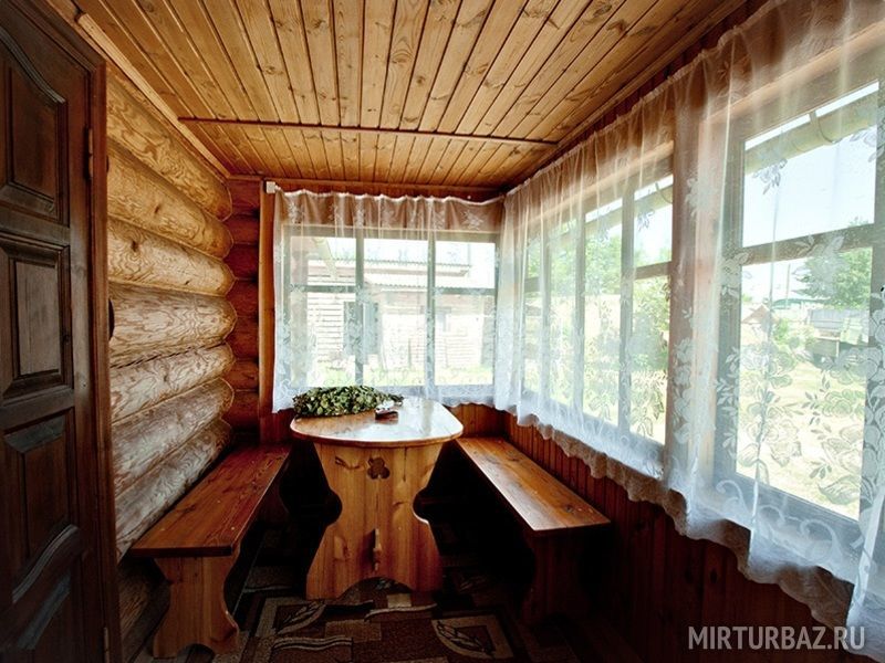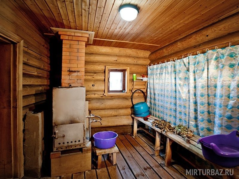 А для тех, кто любит расслабиться после пара и полежать — топчан из натурального дерева. Предоставляются берёзовые веники, шапочки, полотенца, посуду для чаепитий и застолий.