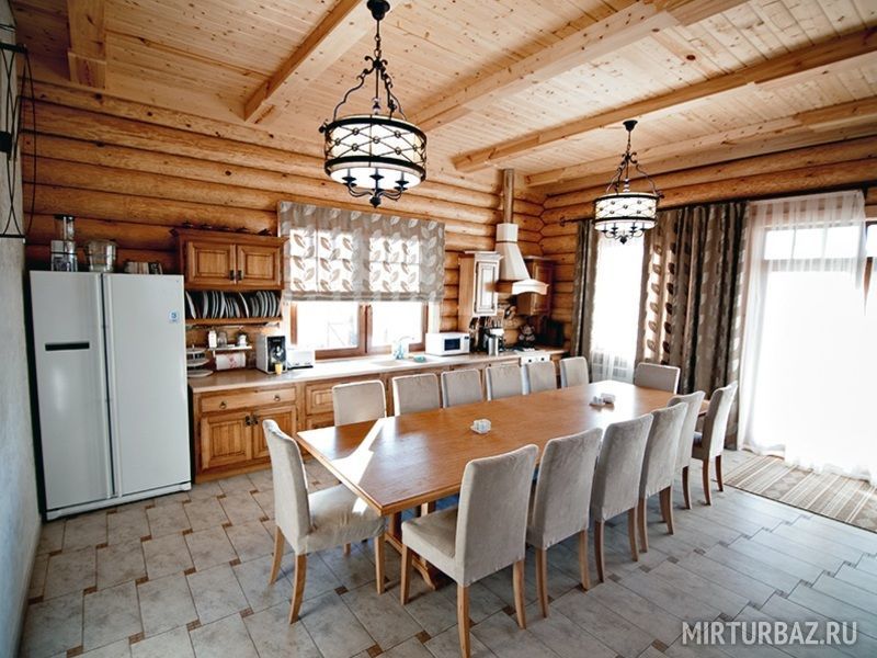 На кухне есть все необходимое для приготовления пищи — холодильник, микроволновая печь, посуда и столовые приборы. За трапезой компания может собраться за большим столом на 10 персон.