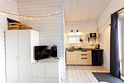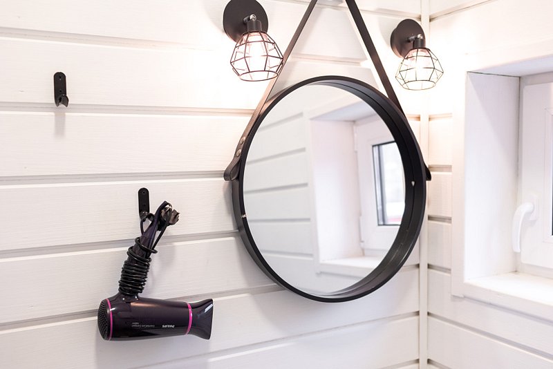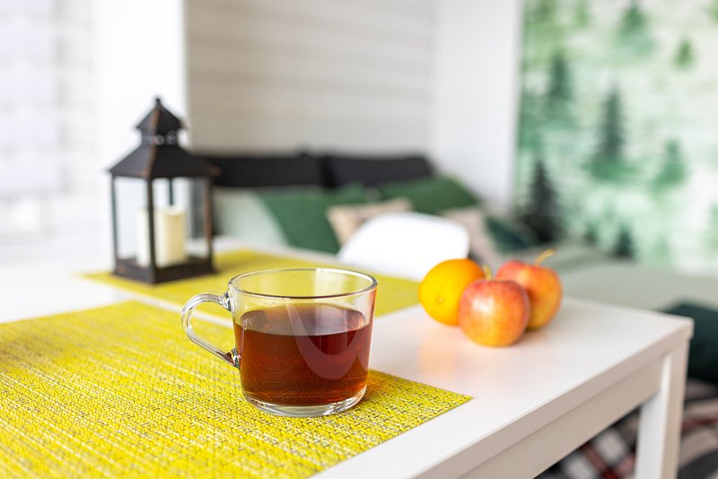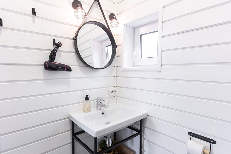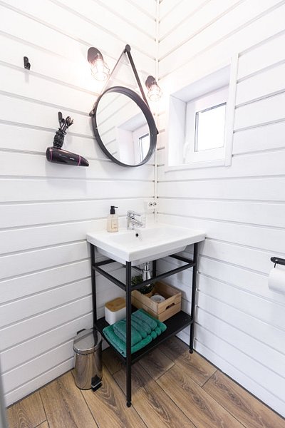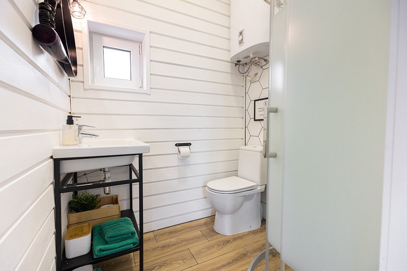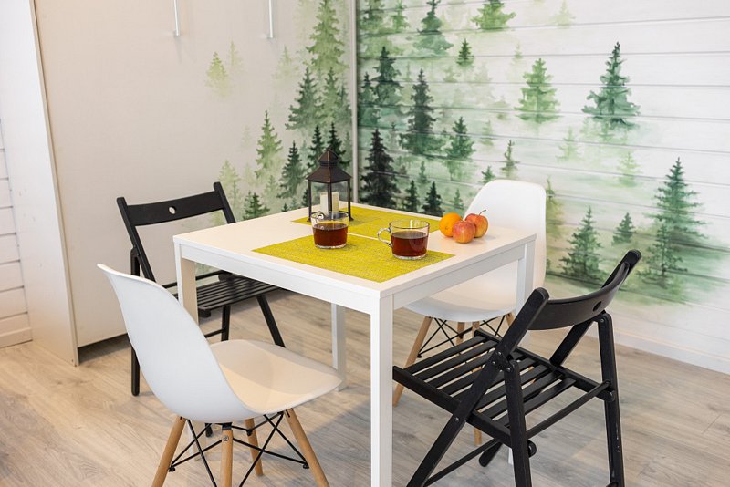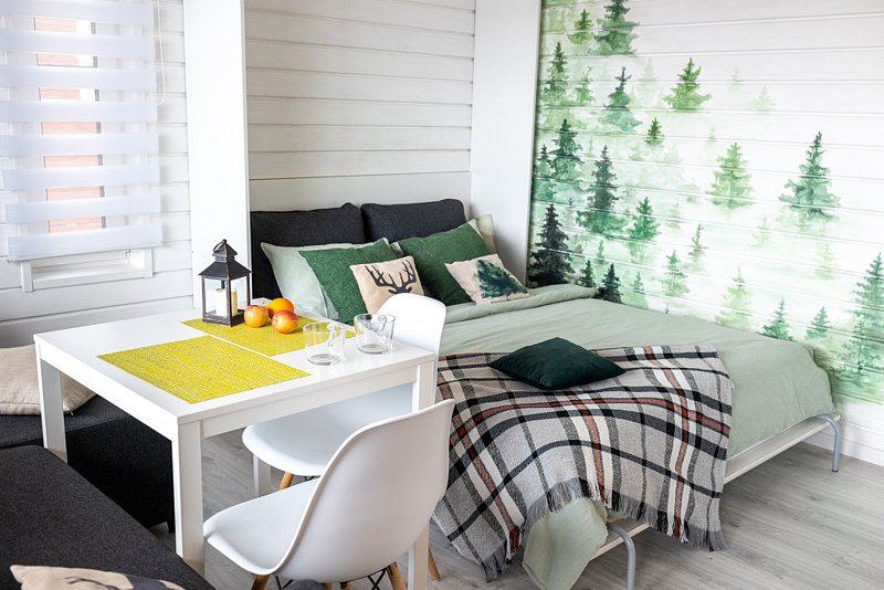 Коттедж со светло-зеленым интерьером лесной атмосферы и оленями на подушках предполагает комфортное размещение до 4 человек. Спальные места: полноценная двухспальная кровать (шкаф-кровать), раскладной диван. Оборудованная для самостоятельного приготовления пищи кухня.