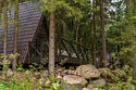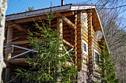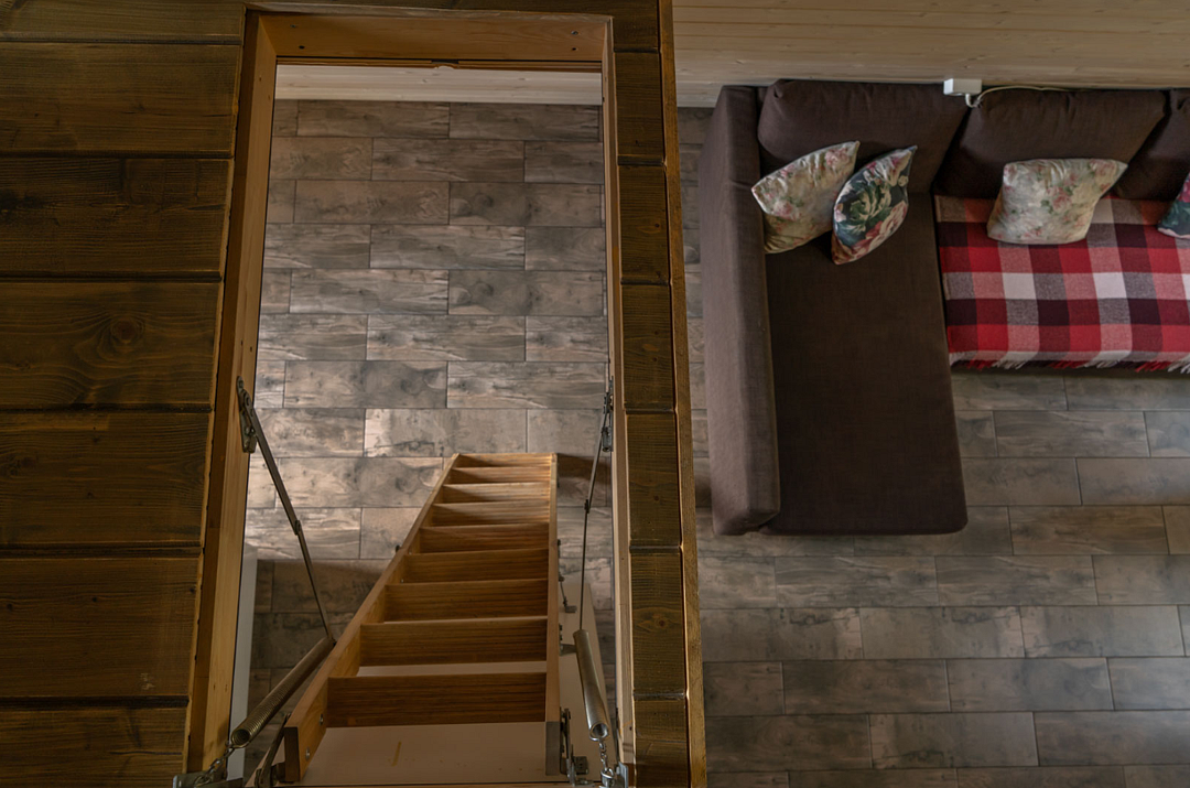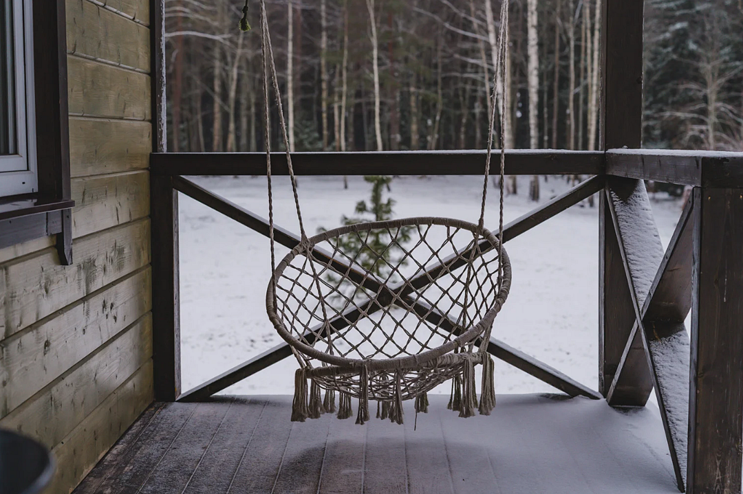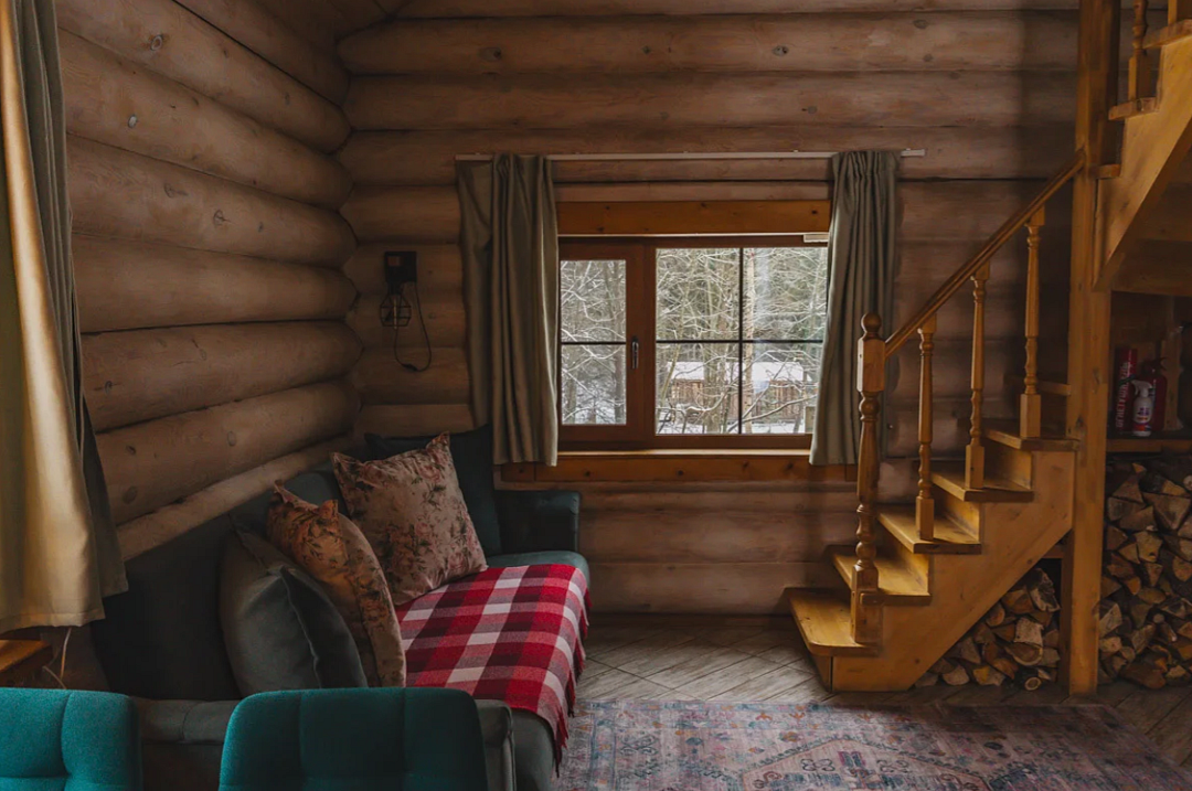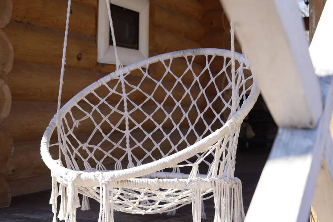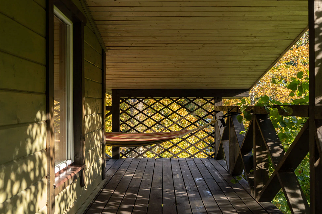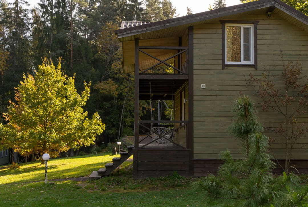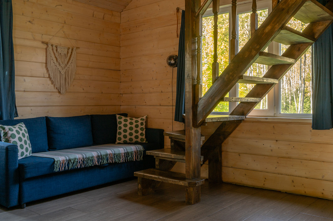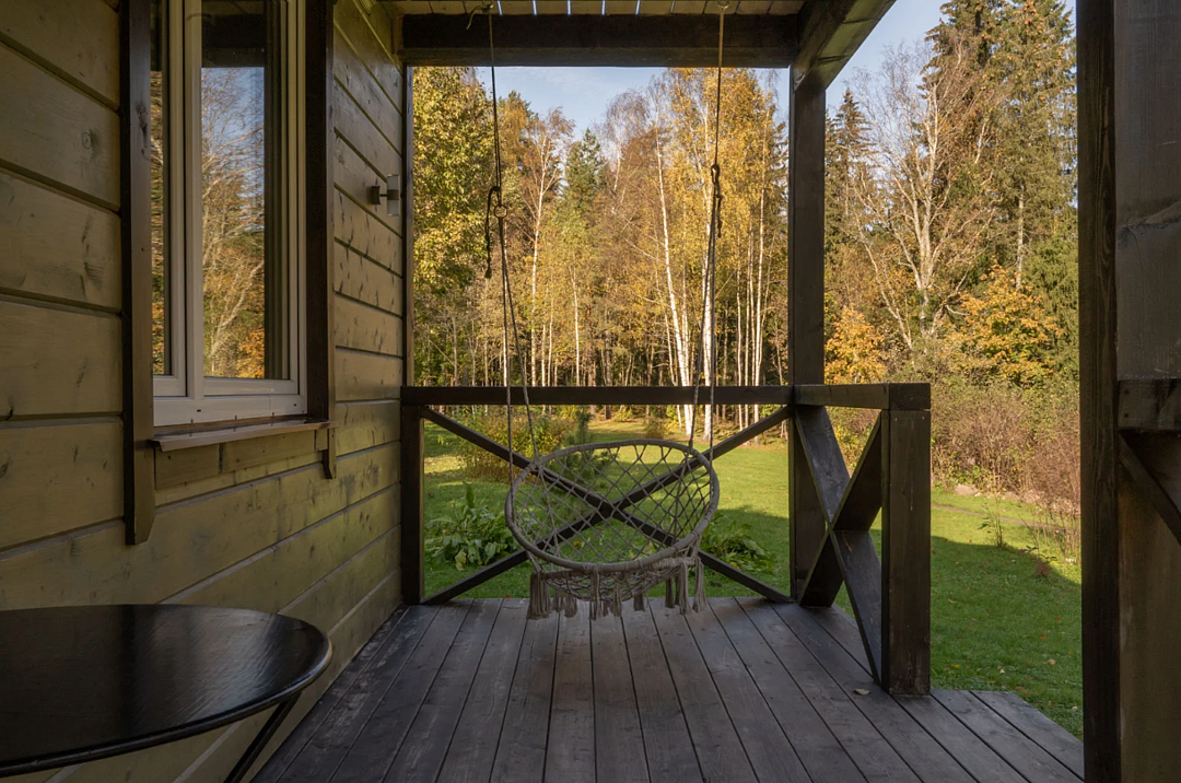 Уютный домик с сауной и камином на склоне холма. Классический деревянный дом площадью 45 м². Двухуровневый бревенчатый свод и прекрасная терраса с панорамным видом и качелью.