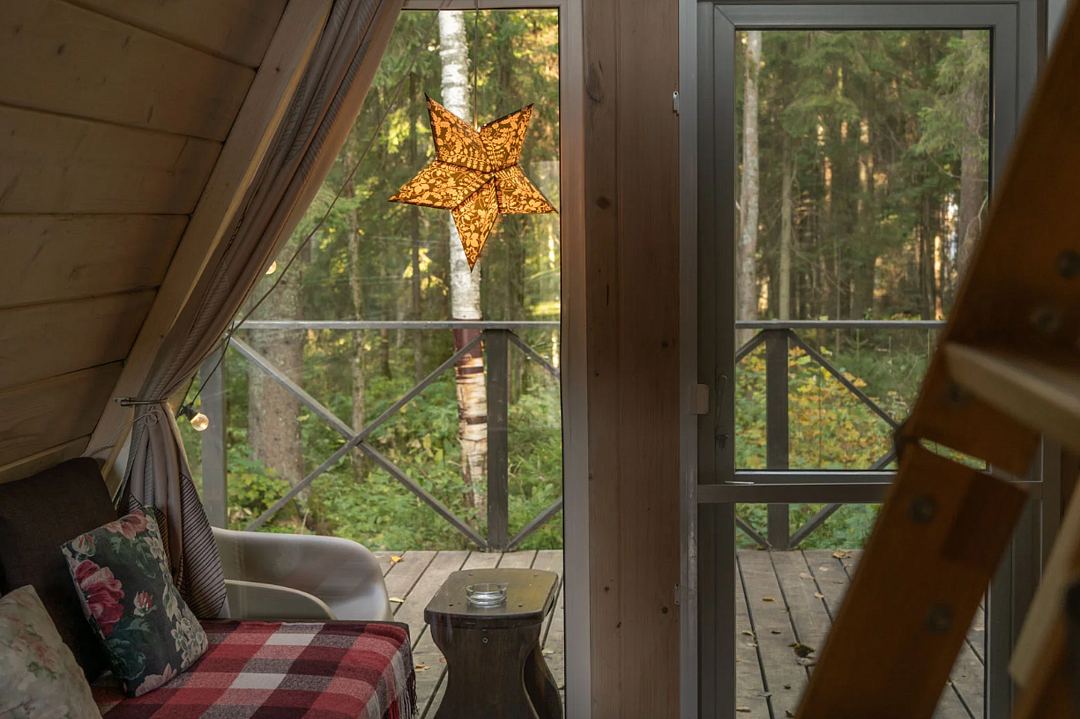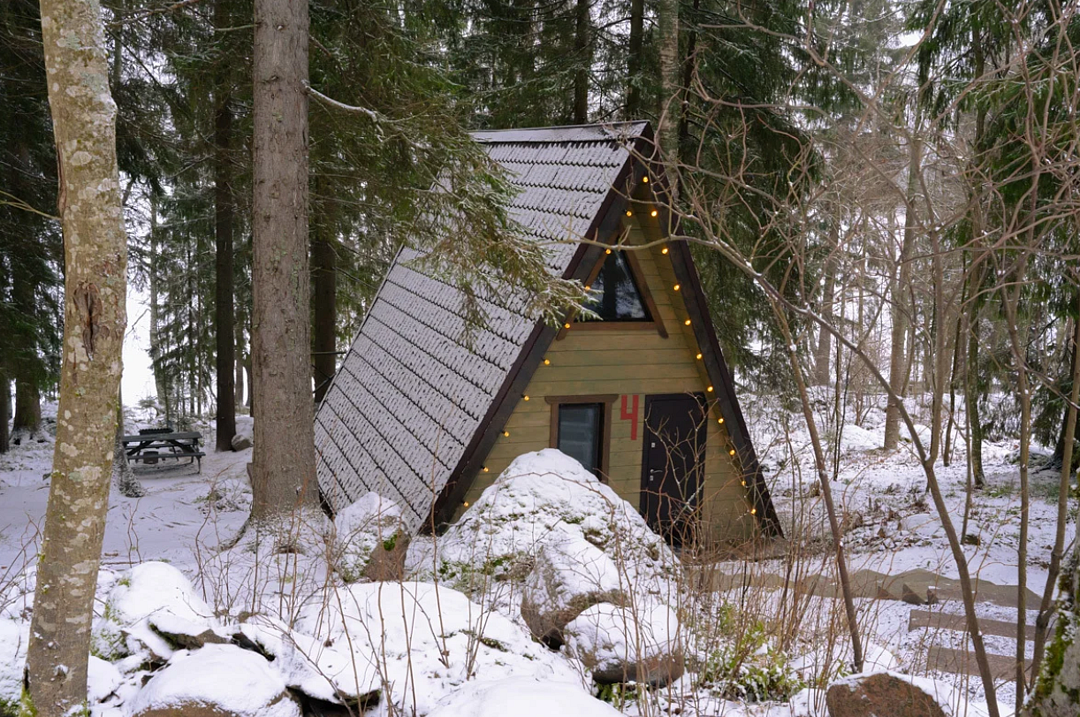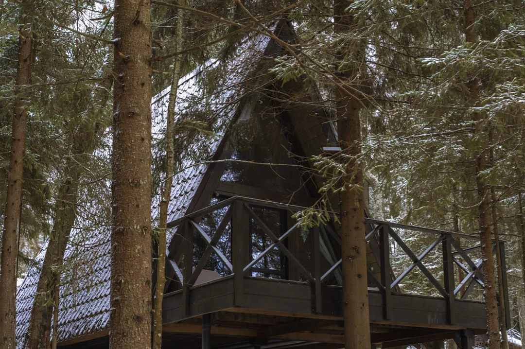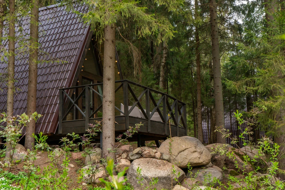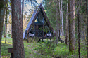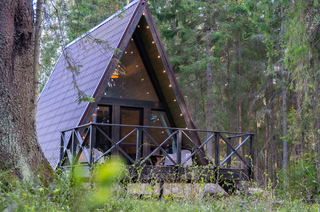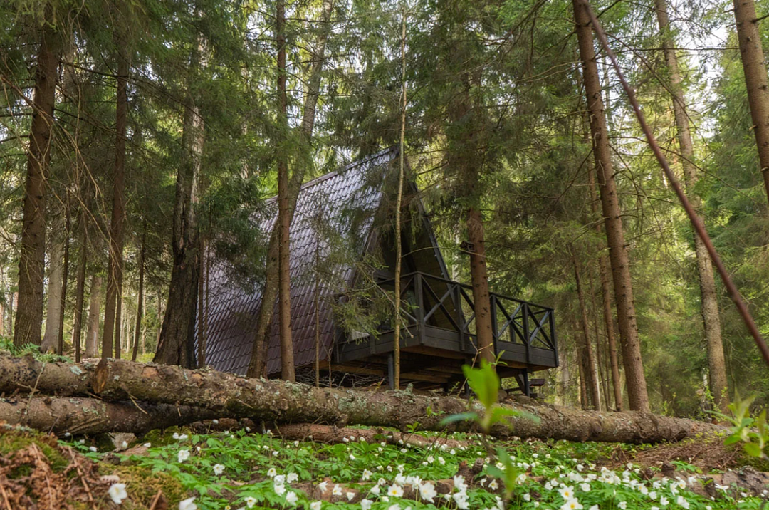 Новый уютный А-образный домик с террасой и выходом в лес, расположенный на опушке рядом с детской площадкой.