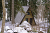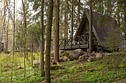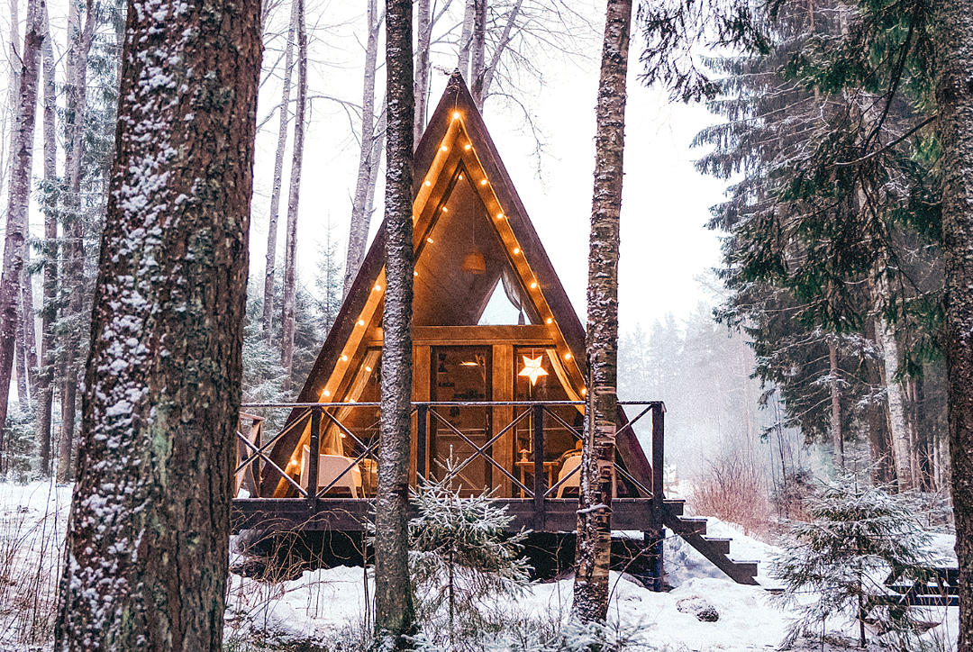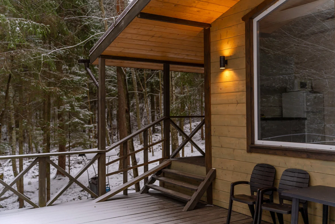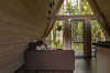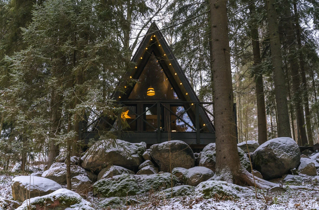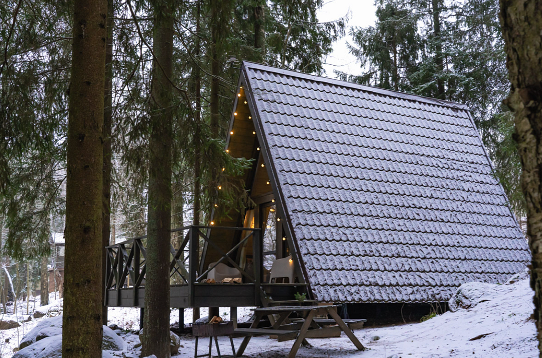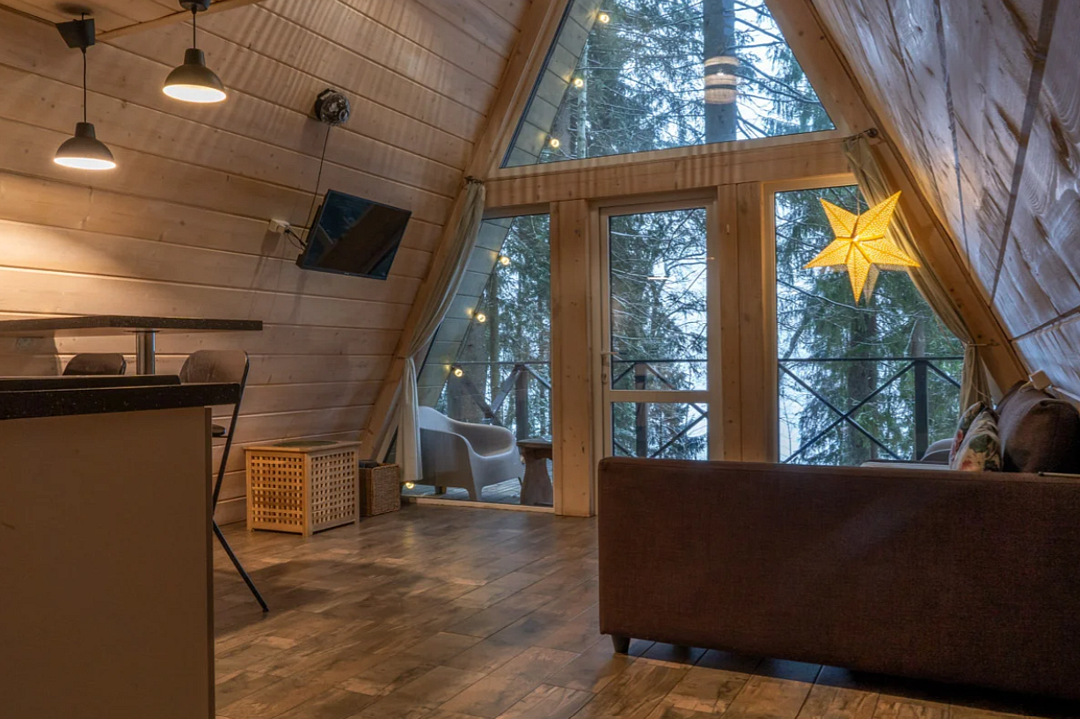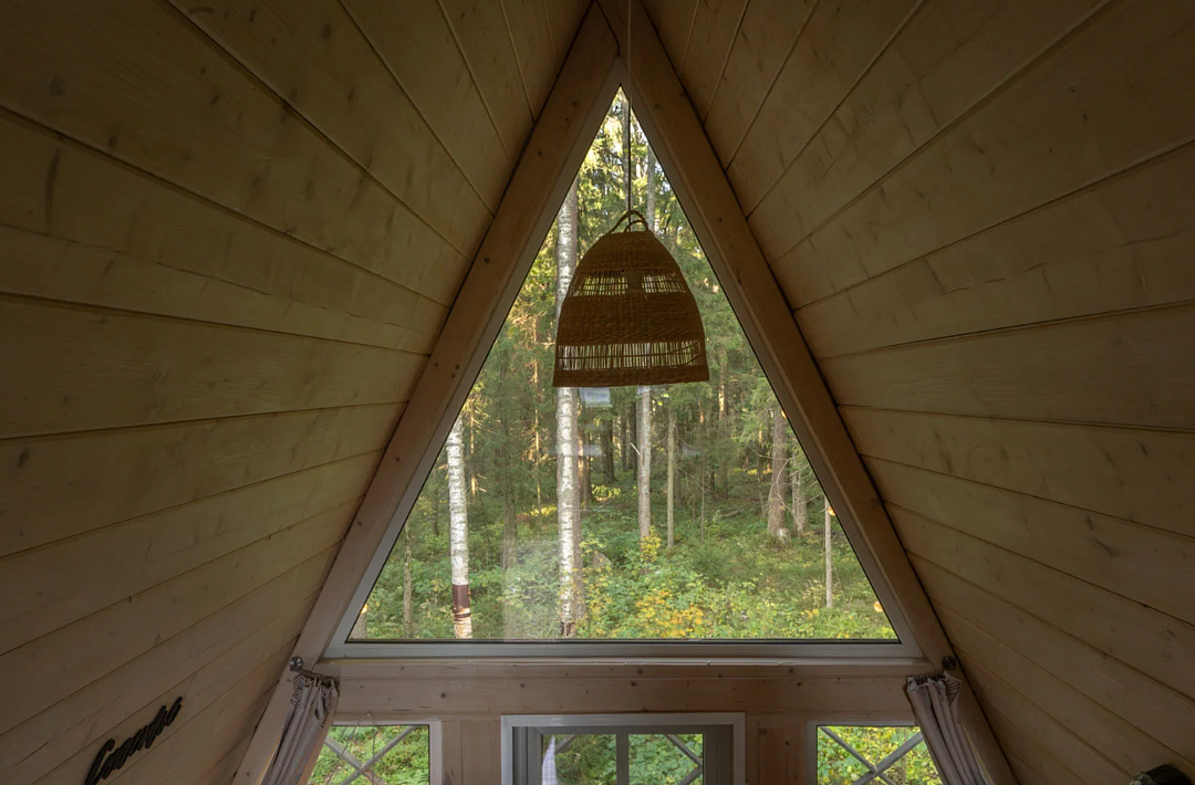 Новый уютный А-образный домик с террасой и выходом в лес, расположенный на опушке рядом с детской площадкой.