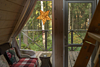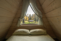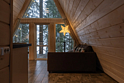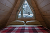 Удобная лестница-трансформер ведет в уютный лофт (9 м²), где располагается полноценное двуспальное место с треугольным окошком и шторами.