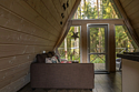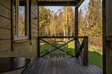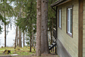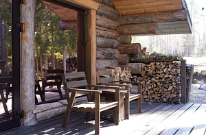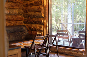 Из дома есть прямой выход на террасу (16 м²), где расположены удобные кресла и стол для отдыха на свежем воздухе. С террасы открывается вид на лес, рядом есть лестница, ведущая к оборудованной мангалом зоне барбекю и берегу.