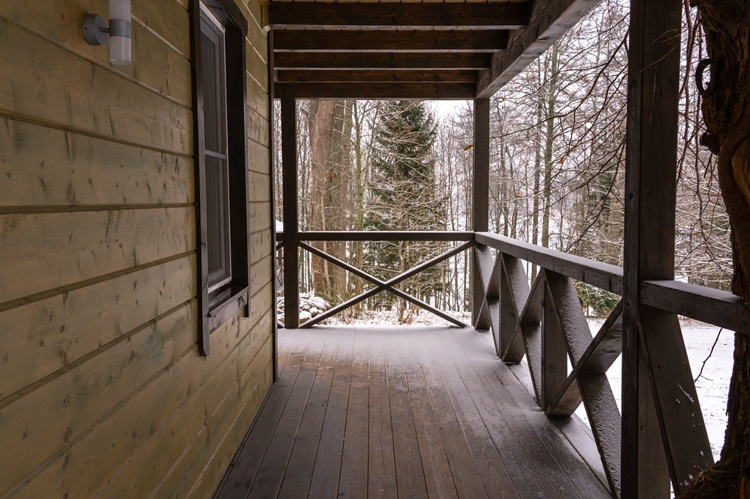 Из дома есть прямой выход на террасу (16 м²), где расположены удобные кресла и стол для отдыха на свежем воздухе. С террасы открывается вид на лес, рядом есть лестница, ведущая к оборудованной мангалом зоне барбекю.