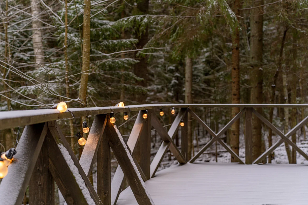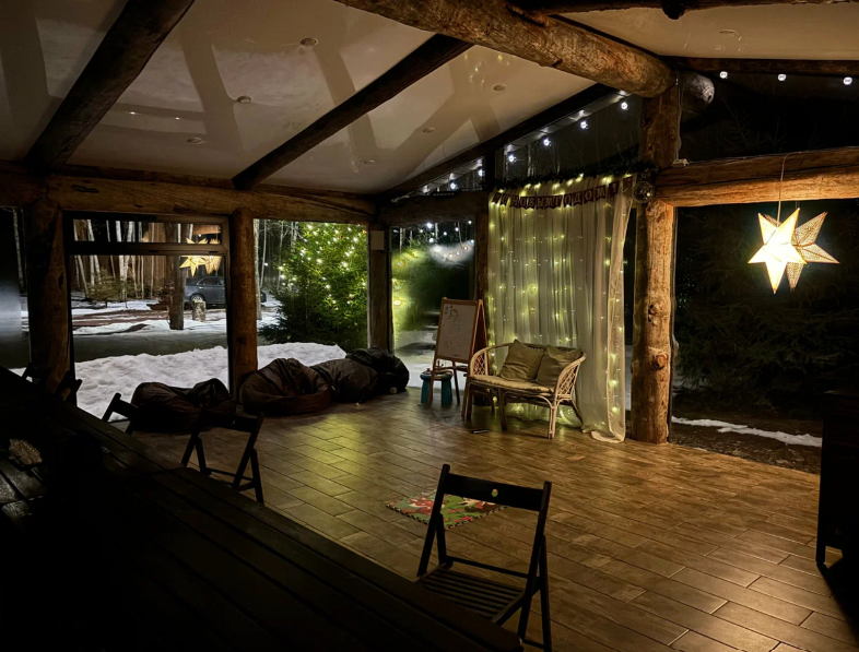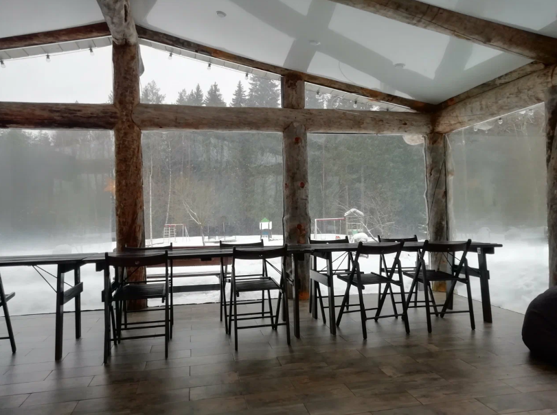 Обогреваемый панорамный зал-шатёр со всеми удобствами для посадки до 25 гостей. В теплом шале есть WiFi, пуфики, стол, настольные игры, книги, проигрыватель и телевизор. Всегда открыто в свободном доступе для гостей.