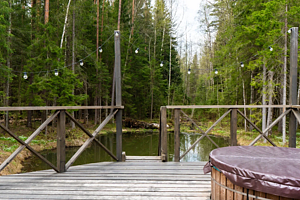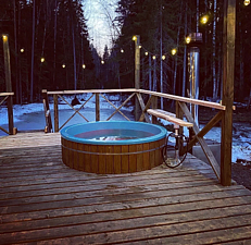 Инфраструктура: купель, зона отдыха, полотенца, простыни, шапочки, дубовые веники, чай/угощенияМинимальное время аренды: 2 часаСруб из карельской сосны, купель на террасе с выходом к живописному лесному пруду.