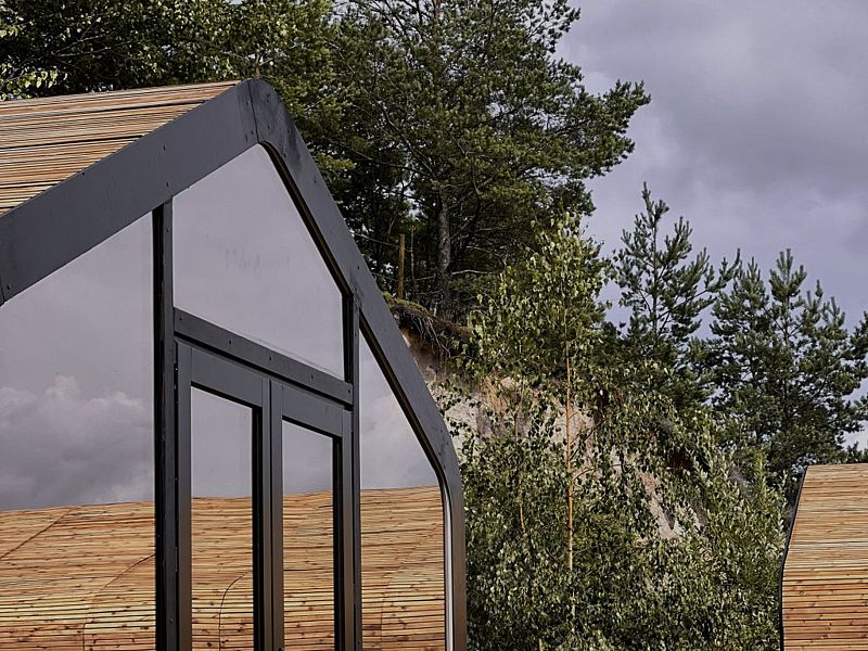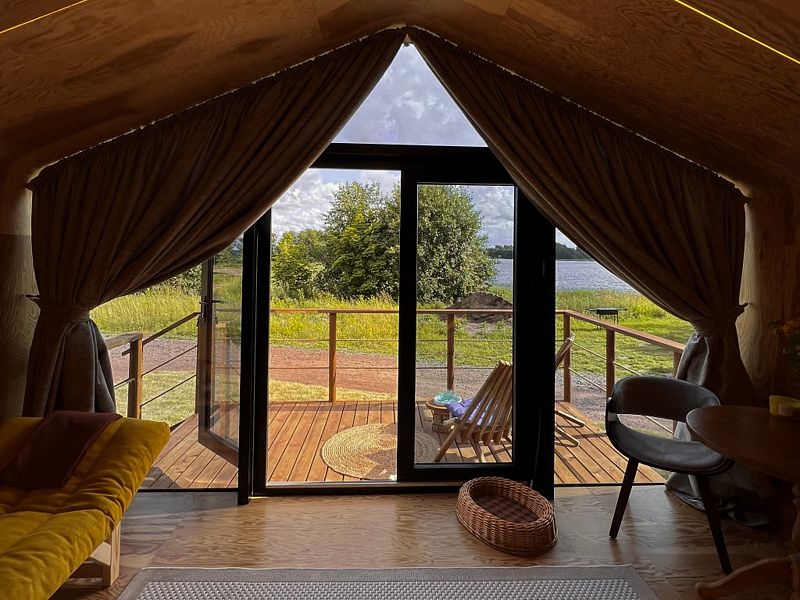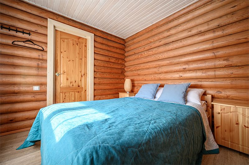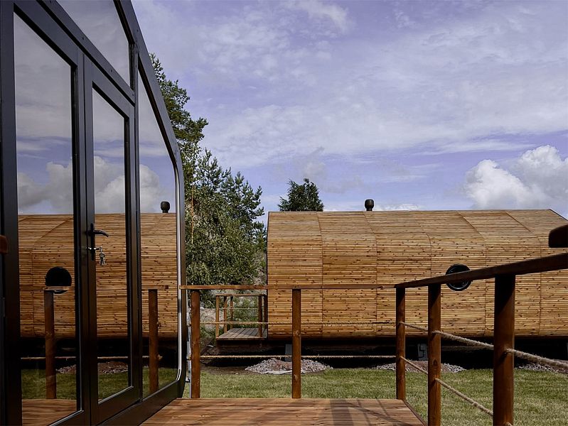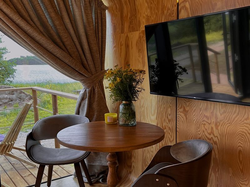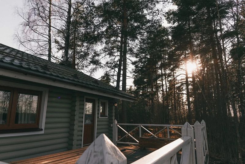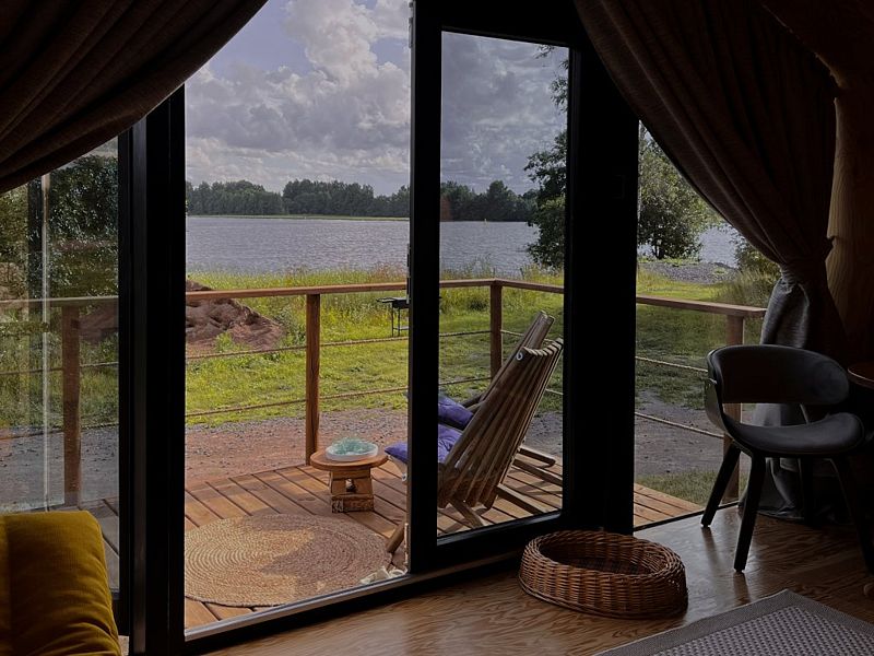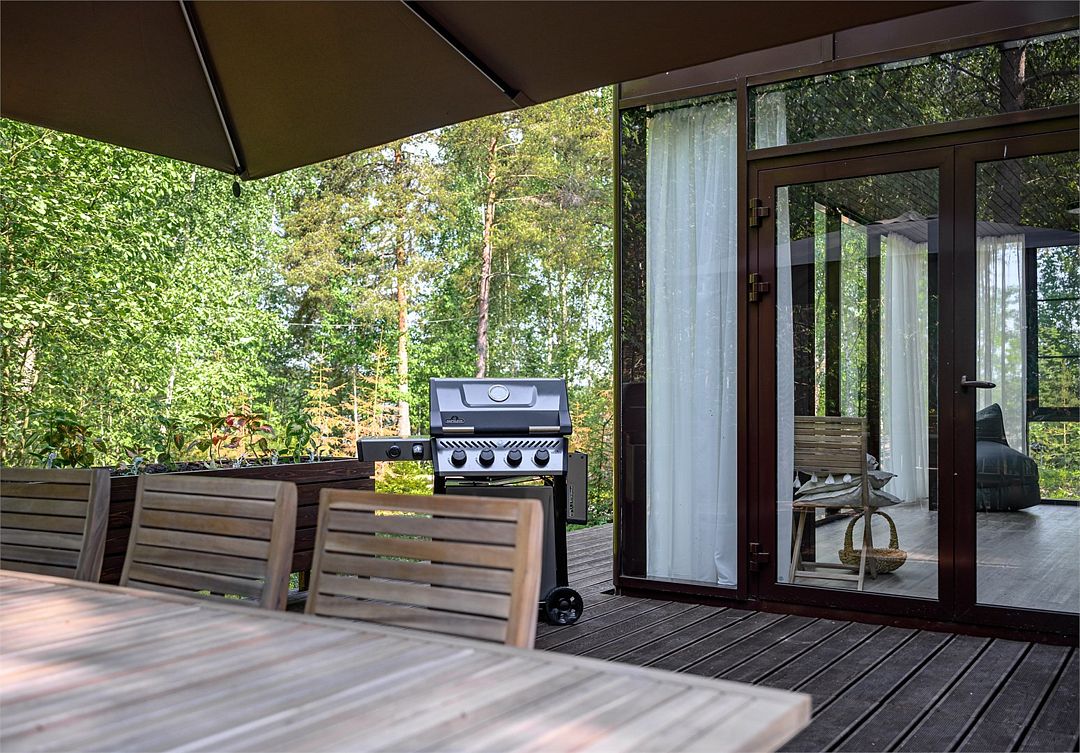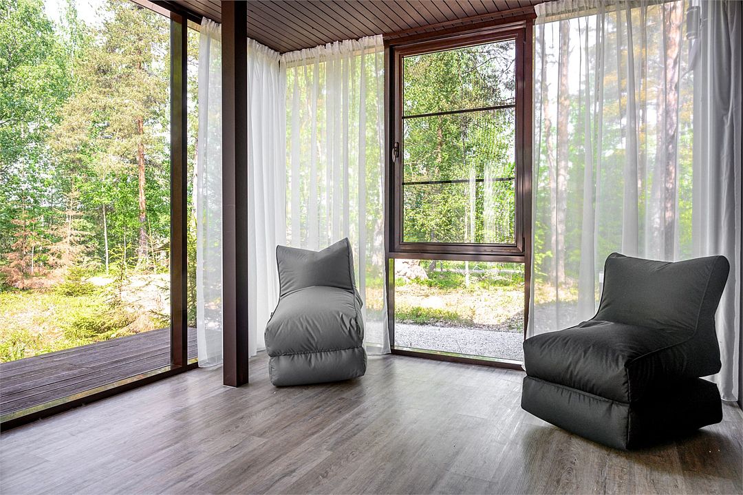 Деревянный коттедж с панорамными окнами Интерьер выполнен с использованием экологичных материалов и природных фактур, сочетая натуральные цвета и яркие акценты Коттедж оборудован видовой террасой с уличной мебелью для размеренного отдыха под открытым небом . При входе расположилась стильная гостиная с кухонным гарнитуром, далее по мере продвижения вглубь пространства - функциональная ванная комната, а в самом удалённом уголке - изолированная спальня с выходом на уютную мини-террасу Рядом оборудована мангальная зона с видом на Сайменский канал