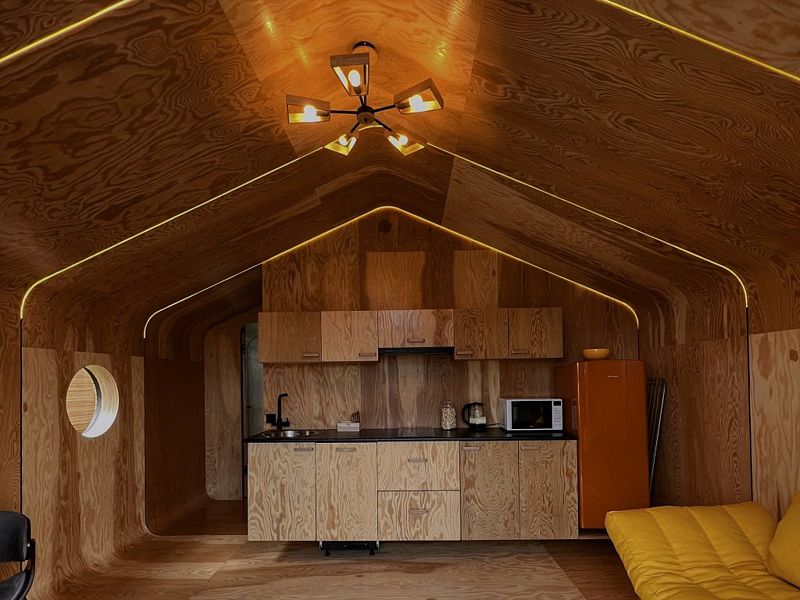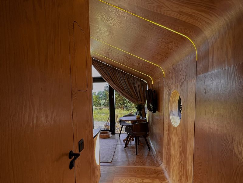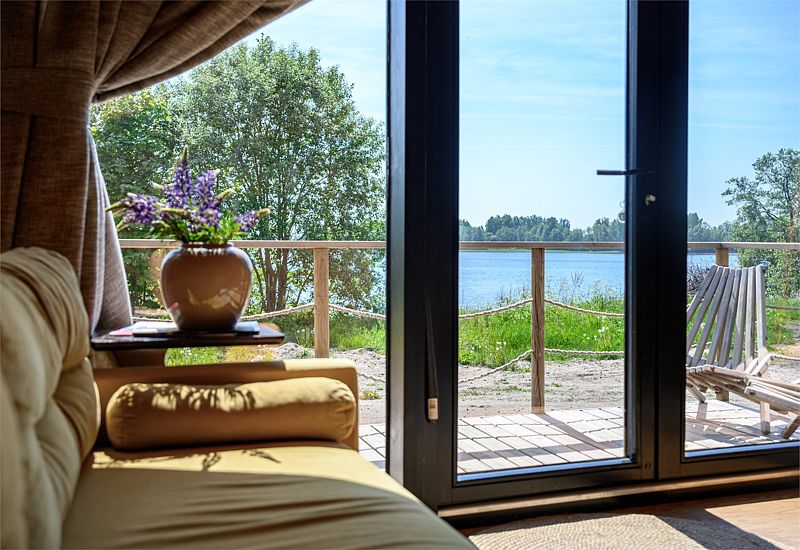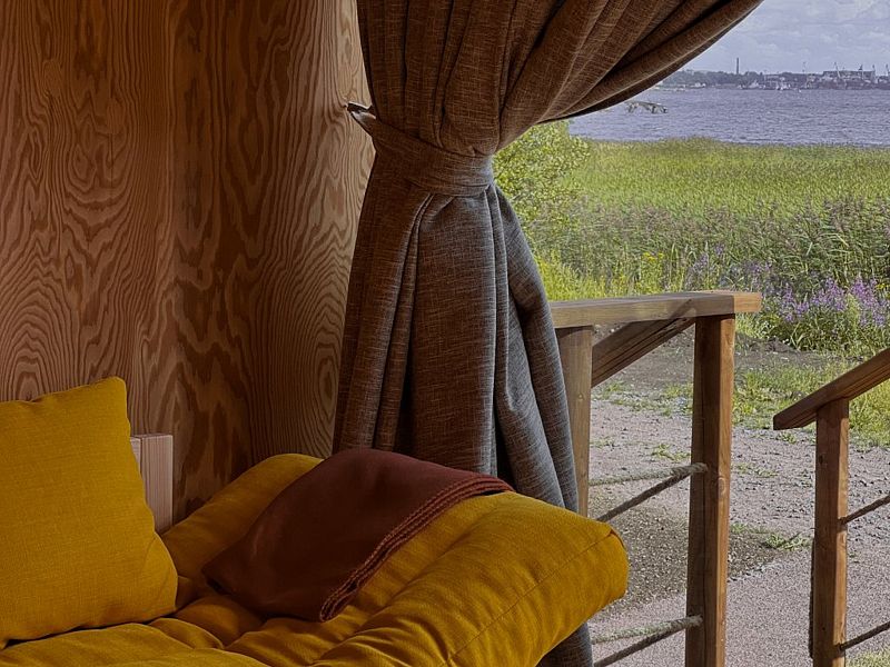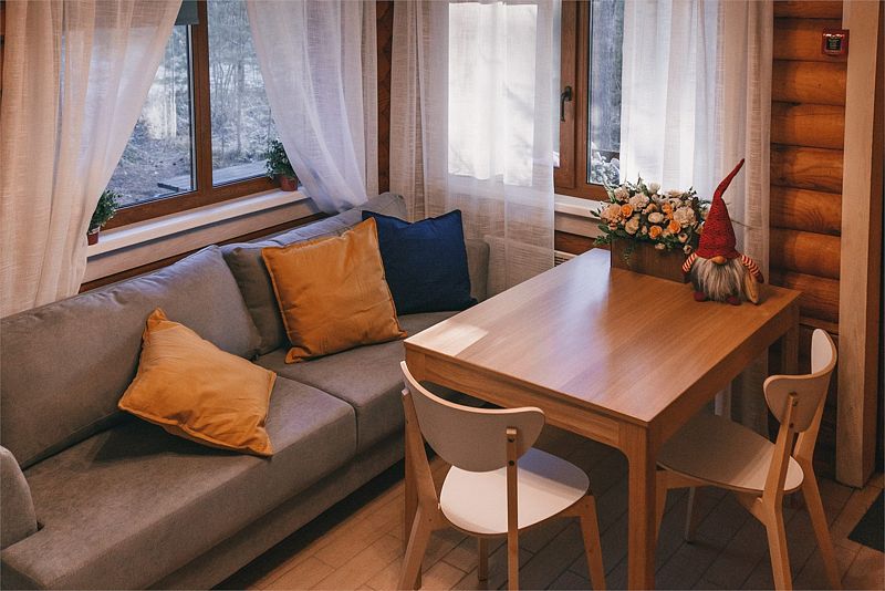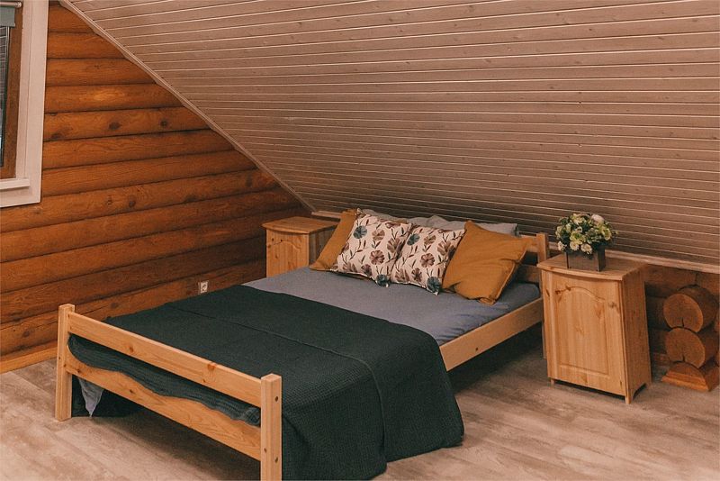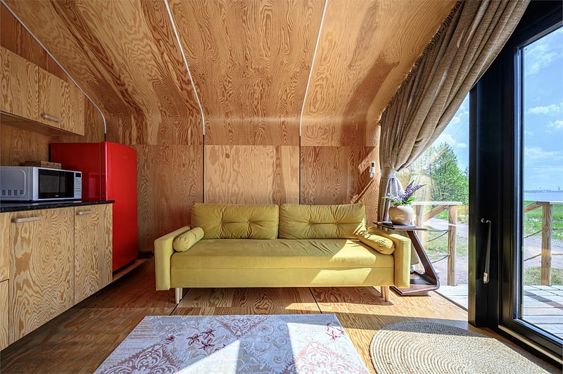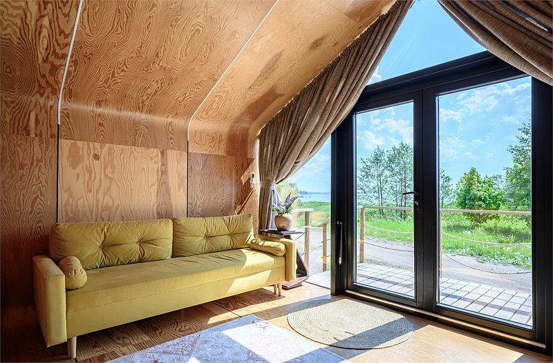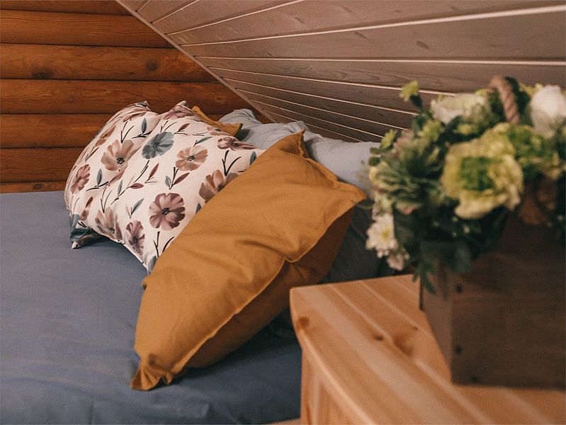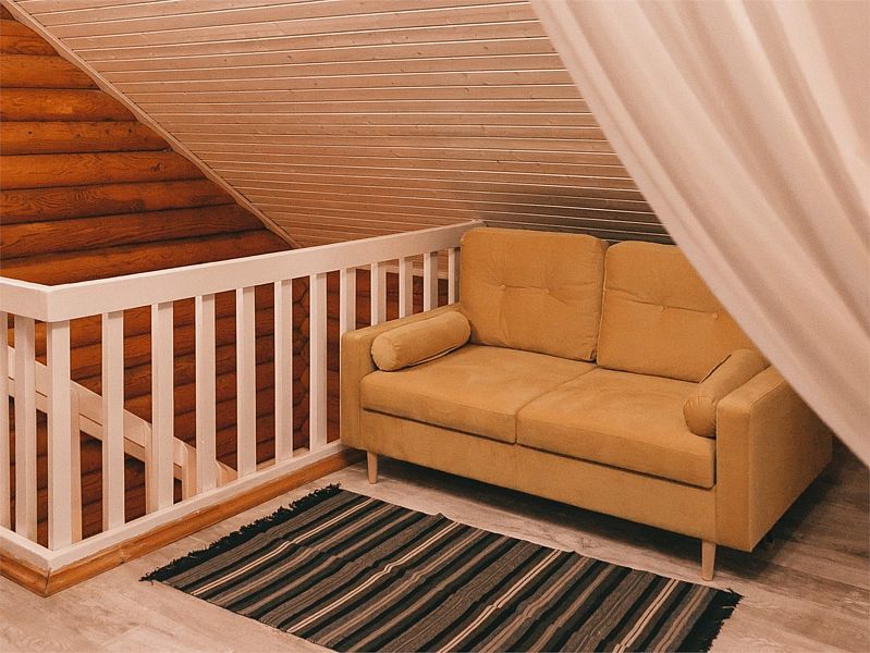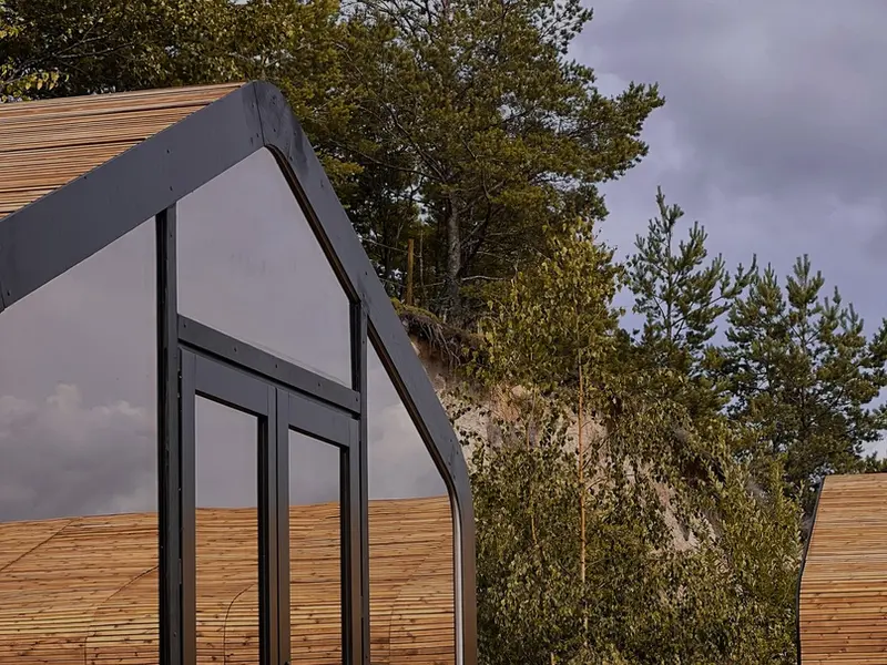 Деревянный коттедж с панорамными окнами Интерьер выполнен с использованием экологичных материалов и природных фактур, сочетая натуральные цвета и яркие акценты Коттедж оборудован видовой террасой с уличной мебелью для размеренного отдыха под открытым небом . При входе расположилась стильная гостиная с кухонным гарнитуром, далее по мере продвижения вглубь пространства - функциональная ванная комната, а в самом удалённом уголке - изолированная спальня с выходом на уютную мини-террасу Рядом оборудована мангальная зона с видом на Сайменский канал