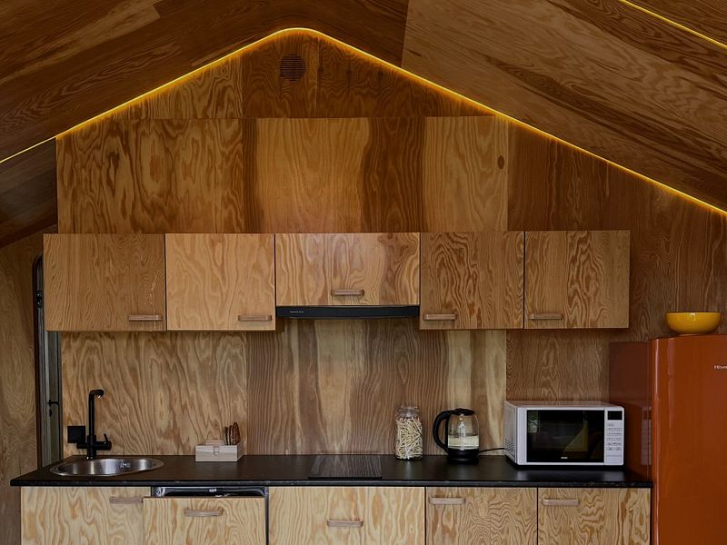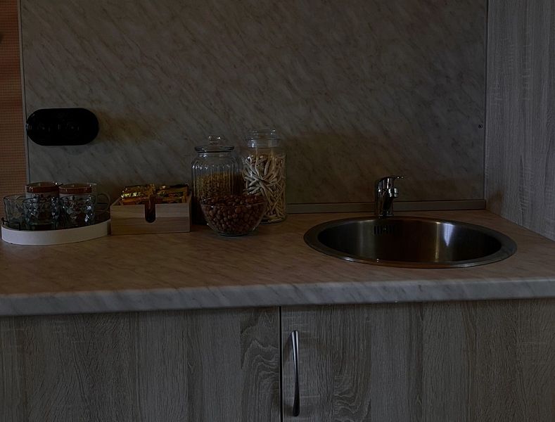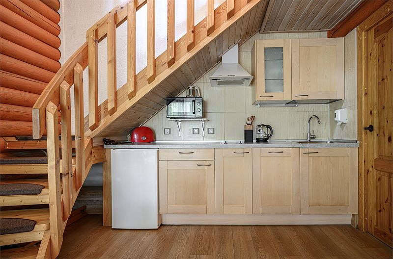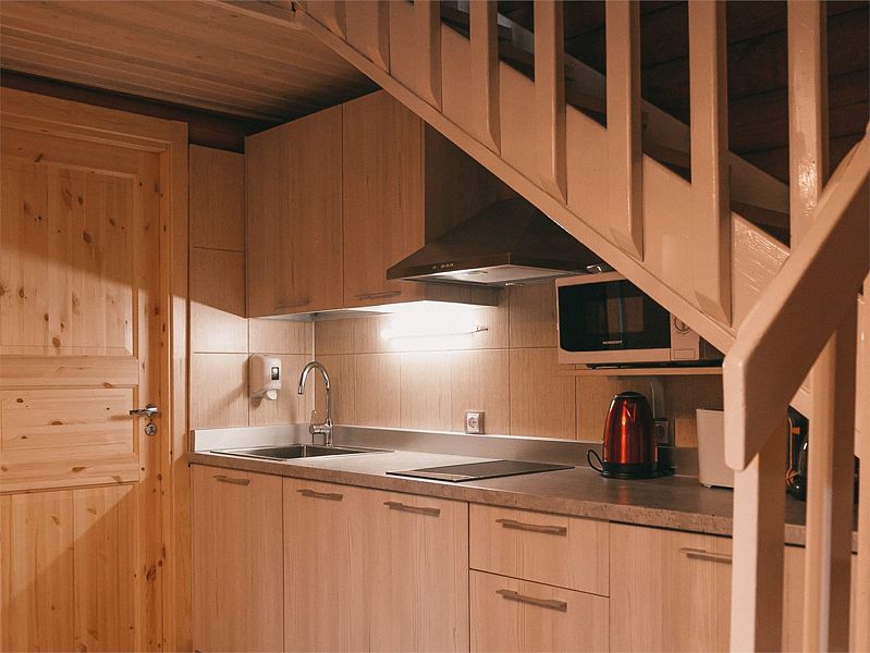 На первом этаже располагается полноценный кухонный гарнитур, гостиная зона, закрытая спальня и санузел,