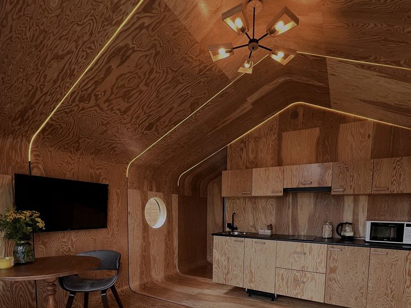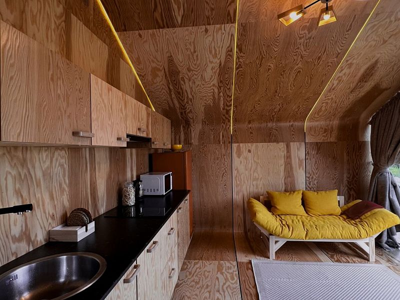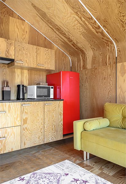 На первом этаже располагается полноценный кухонный гарнитур, гостиная зона, закрытая спальня и санузел, на втором – спальня-студия с диваном и выходом на открытый балкон