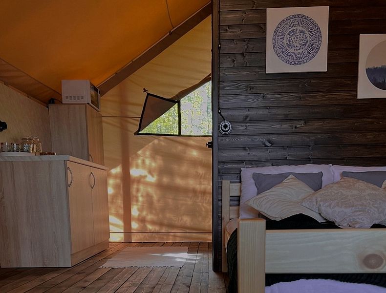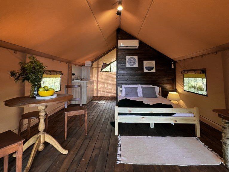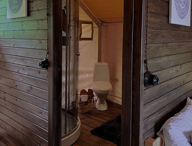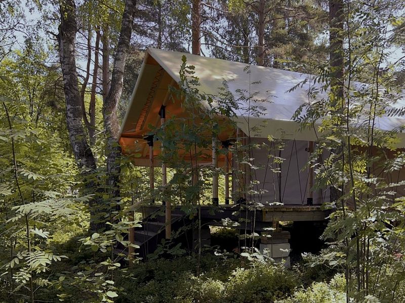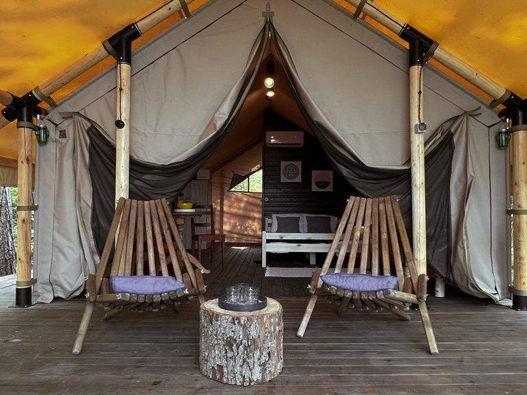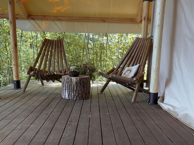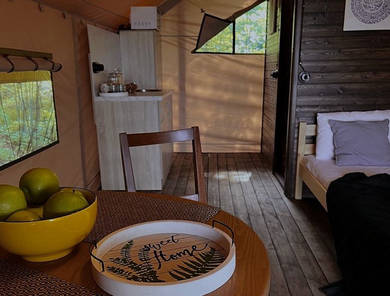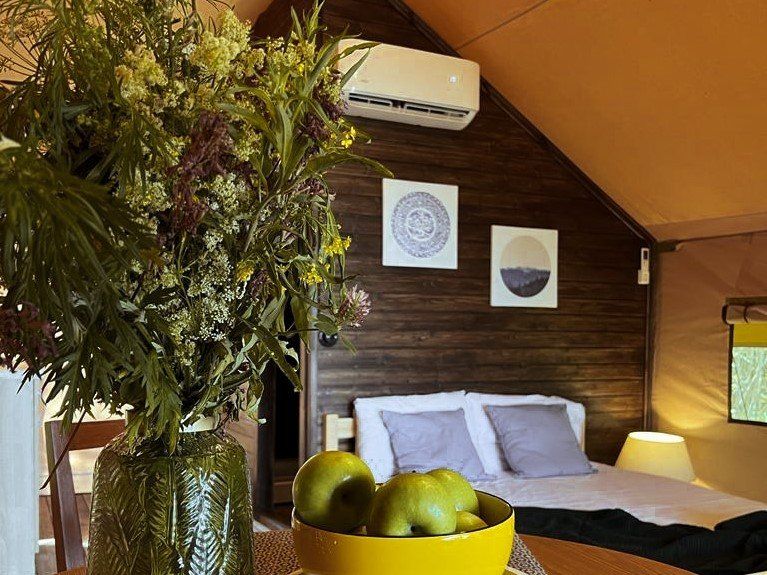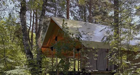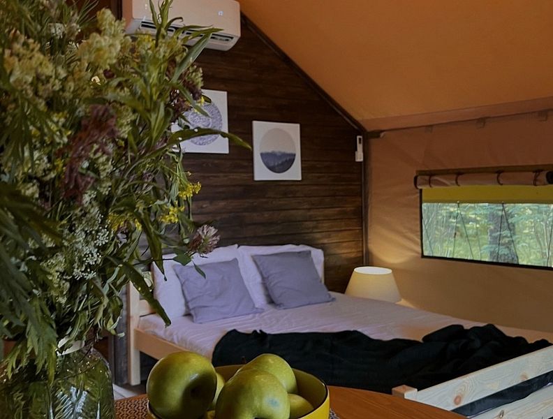 Просторный шатёр среди деревьев, оборудованный всем необходимым для комфортного проживания Подходит для двоих человек, также возможно размещение питомца В Вашем распоряжении собственная терраса с деревянной мебелью, кухонная зона с полным набором посуды, мини-холодильником, электроплитой и микроволновой печью, санузел внутри шатра с душевой кабиной Также в шатре установлен кондиционер