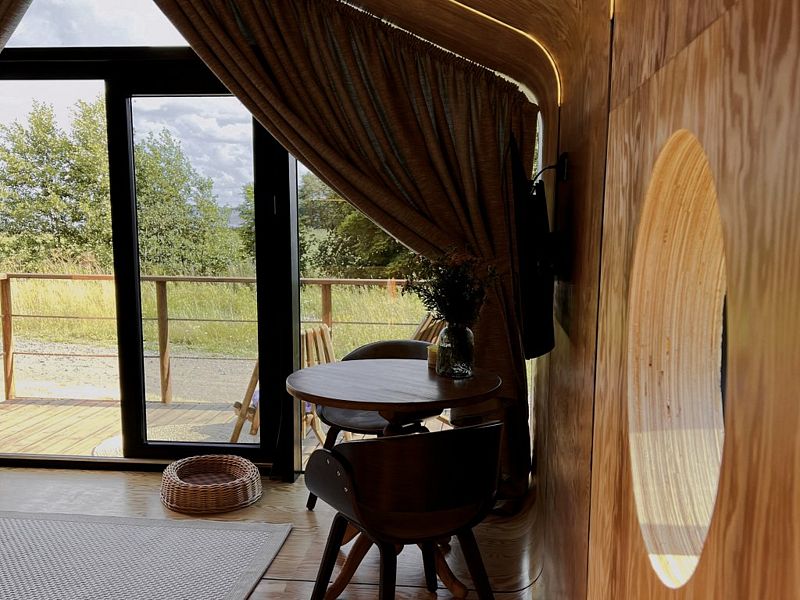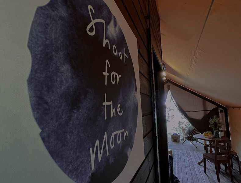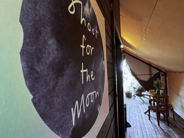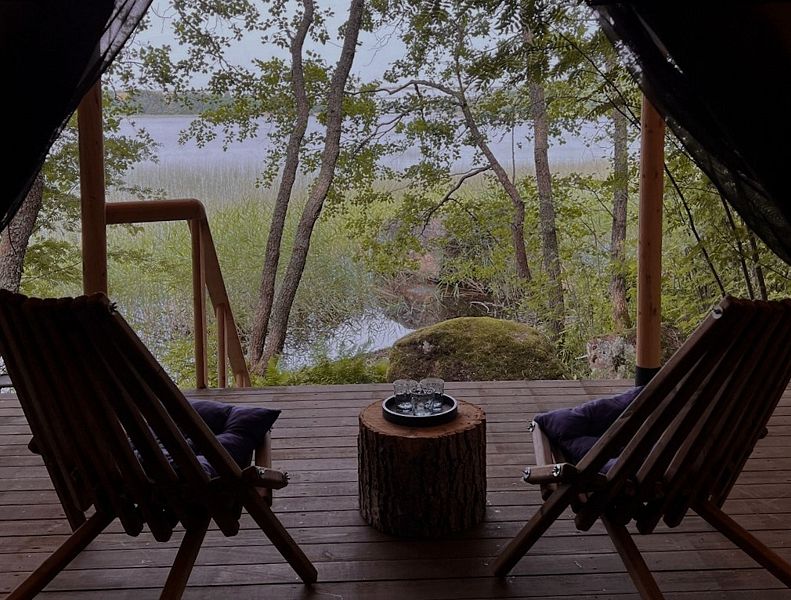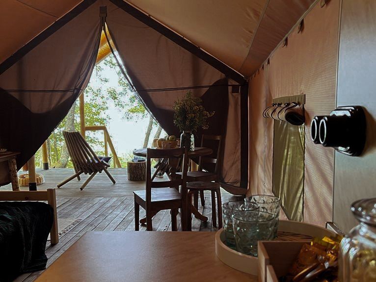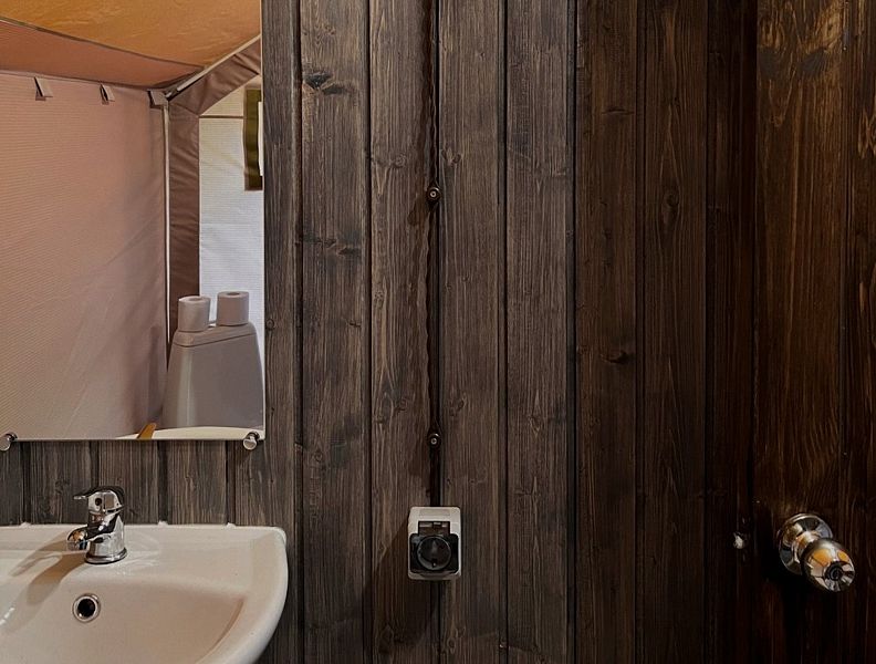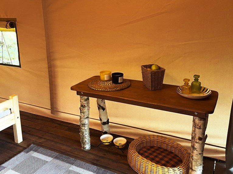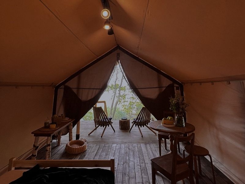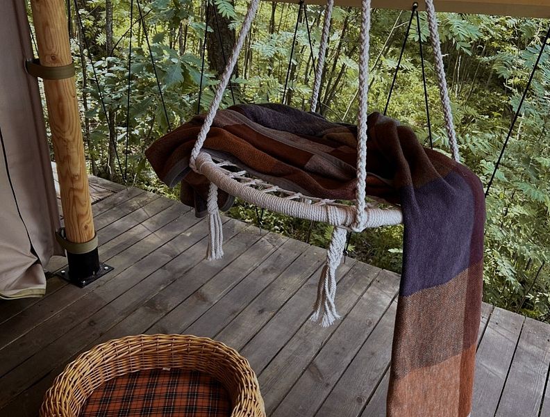 Просторный шатёр среди деревьев, оборудованный всем необходимым для комфортного проживания Подходит для двоих человек, также возможно размещение питомца В Вашем распоряжении собственная терраса с деревянной мебелью, кухонная зона с полным набором посуды, мини-холодильником, электроплитой и микроволновой печью, санузел внутри шатра с душевой кабиной Также в шатре установлен кондиционер