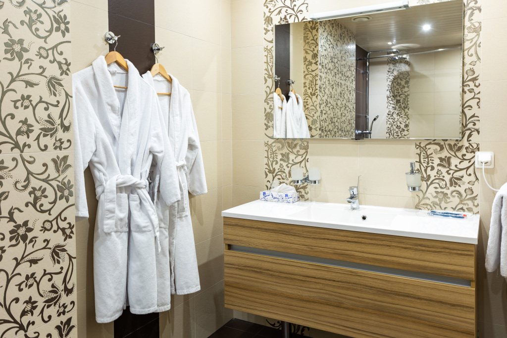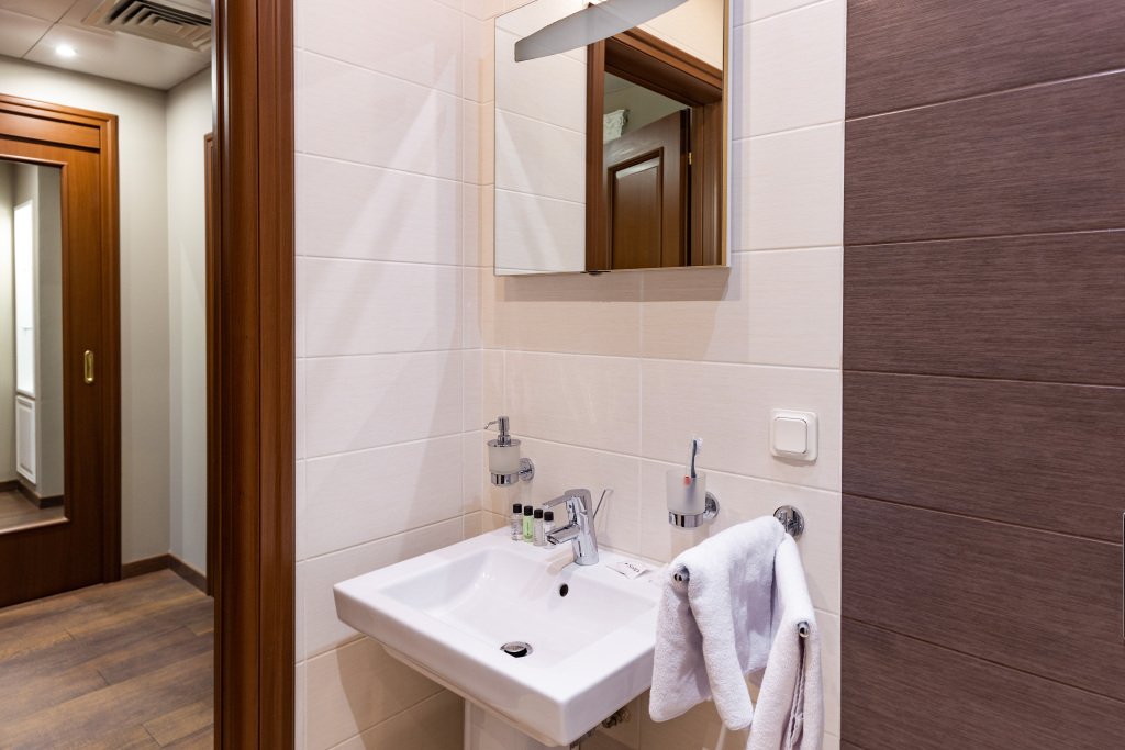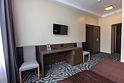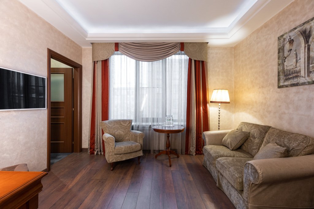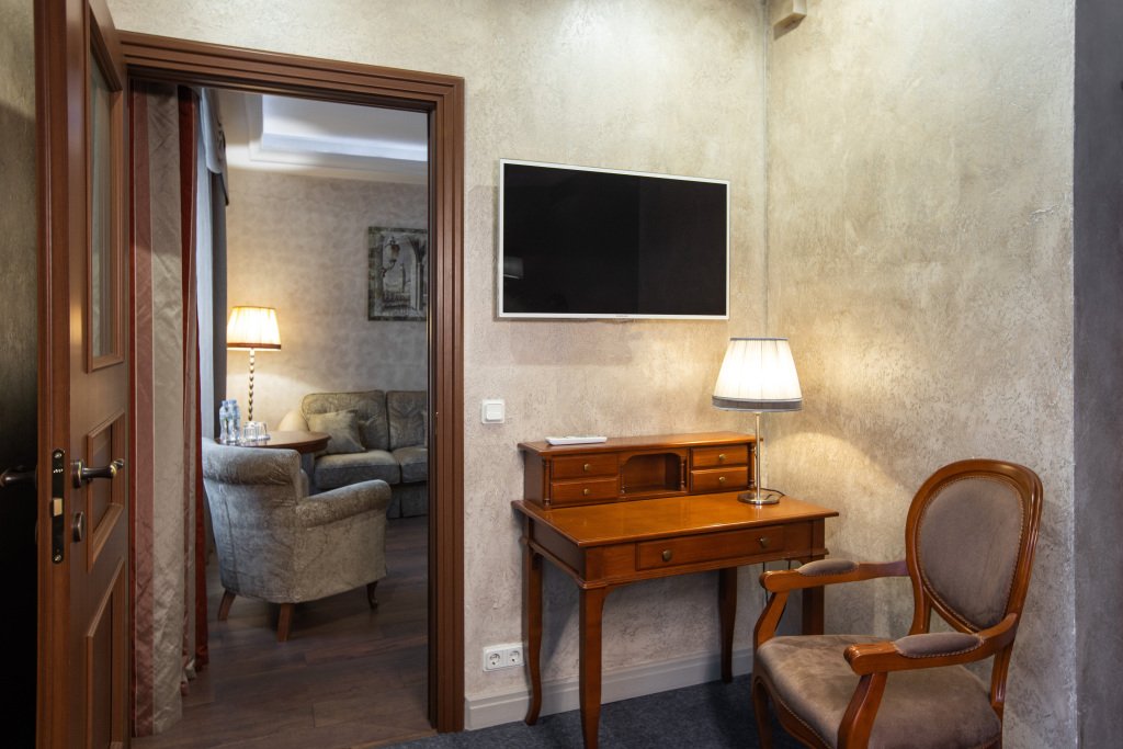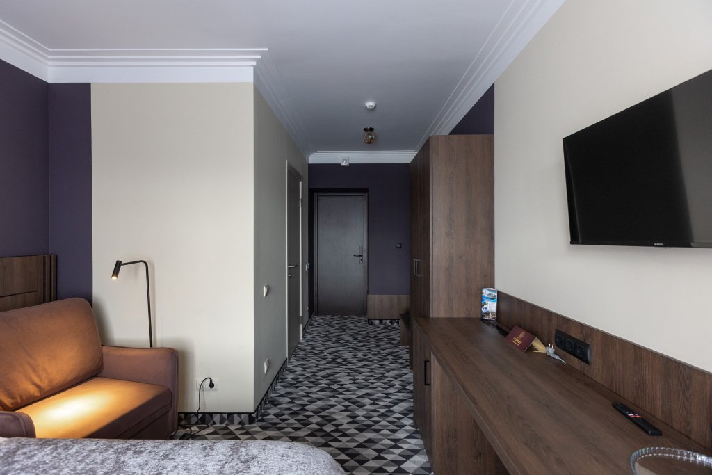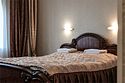 Номерной фонд гостиницы насчитывает 2 номера данной категории, на 4-ом и 5-ом этажах. Номера удобны для проживания и включают 2 комнаты: гостиную и спальню, 2 ванные комнаты. В номере имеются: в спальне - большая двуспальная кровать, в гостиной – раскладной диван, в ванной комнате – ванна, во второй ванной комнате - душ, соответственно, 2 туалета, кондиционер, мини-бар, халат, тапочки, телефон, wi-fi, 2 телевизора, шкаф для одежды с плечиками, рабочее место, набор полотенец, индивидуальные средства гигиены. Окна номеров выходят на центральный проспект города. Покрытие пола – ковролин + ламинат. Площадь номера составляет 20.5 м2. В данной категории номера курение запрещено.Услуги и удобства