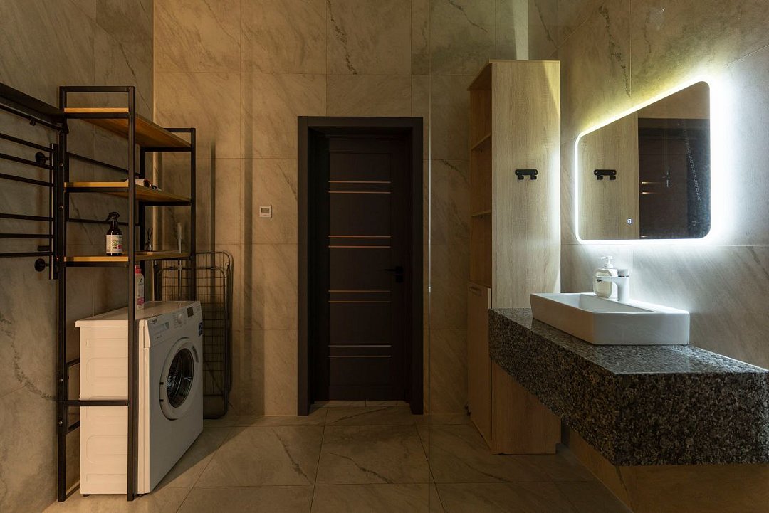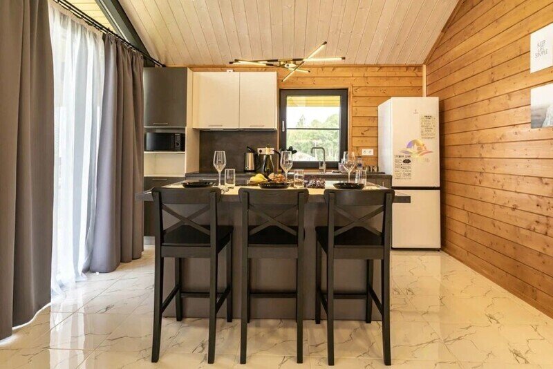 - просторная кухня с островом и всей необходимой бытовой техникой и кухонной утварью;
