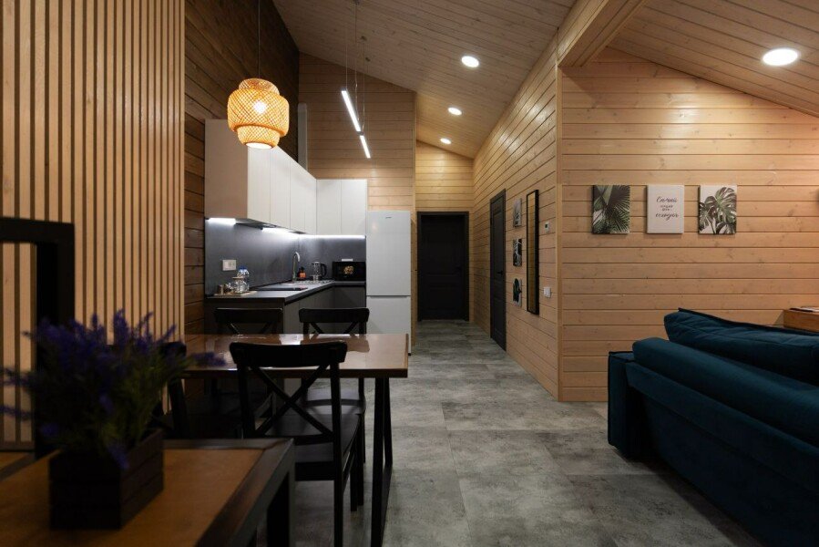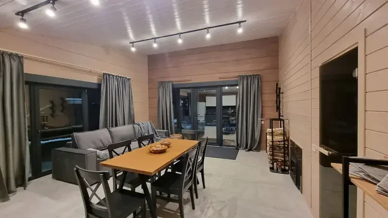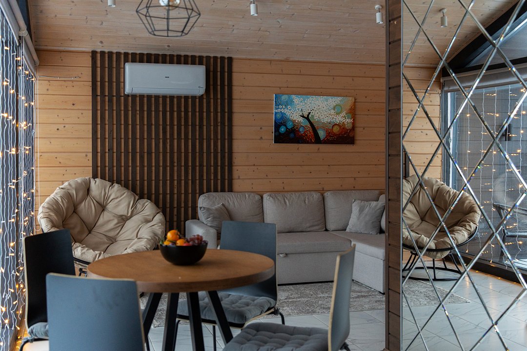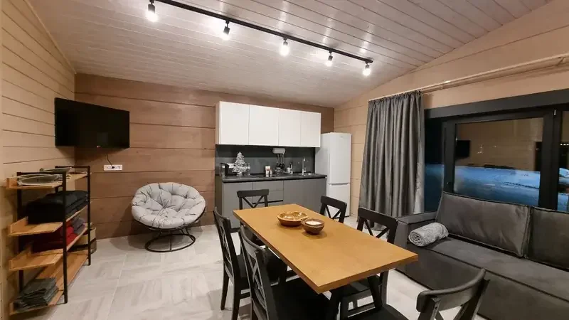 К удобству гостей русская парная на дровах, просторная комната отдыха с кухней, раскладной диван на 2 спальных места, душевая и санузел.