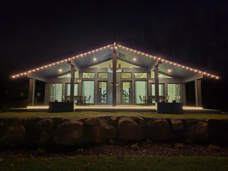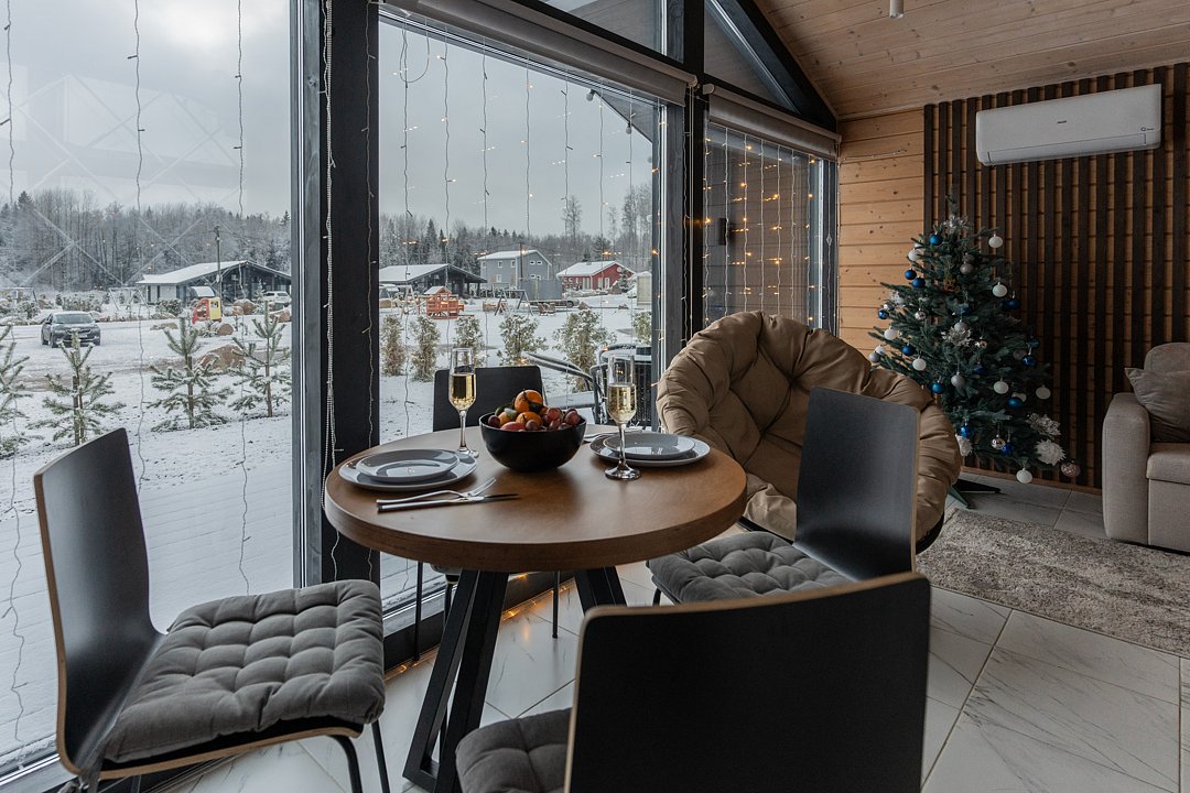 Коттедж расположен на территории новой строящейся базы отдыха «Тихая Гавань» в 10 км от Выборга. Выполнен в современном стиле, функциональный, светлый и просторный.