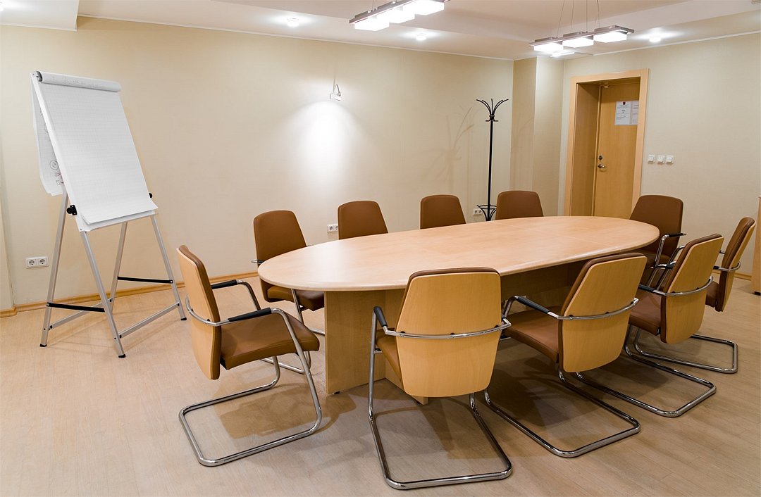 Идеальное место для проведения деловых переговоров и встреч с небольшим количеством участников. В зале установлен овальный стол для переговоров.