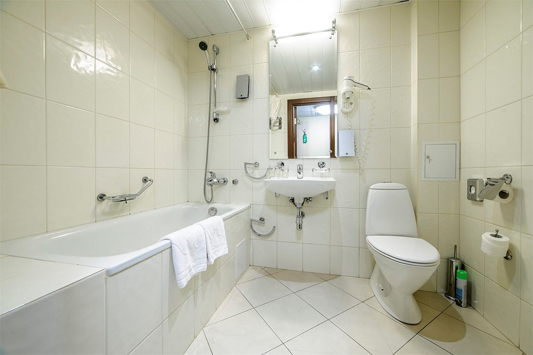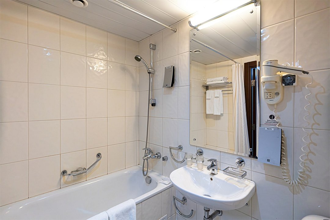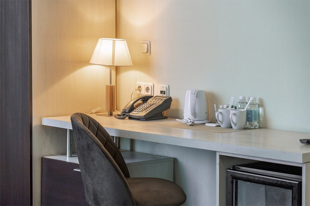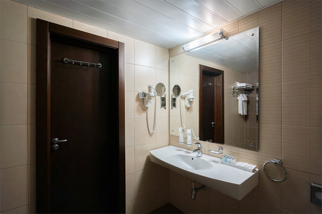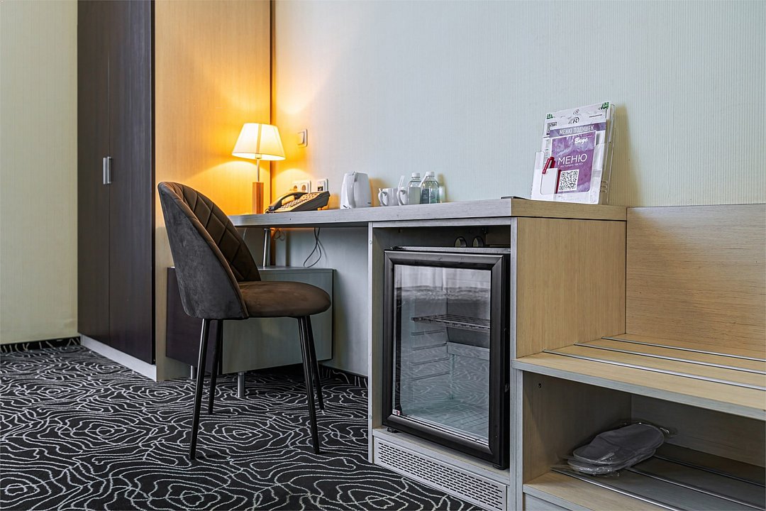 В номере 2 односпальные кровати ( при необходимости возможно соединение в одну кровать), прикроватная тумба, пуф, платяной шкаф, в некоторых номерах малый 2-х секционный шкаф, зеркало во весь рост с вешалкой для верхней одежды, сейф, охлаждающий шкаф для напитков, чайная станция, ЖК ТВ (спутниковое ТВ) , телефон, ванная, фен.Услуги и удобства