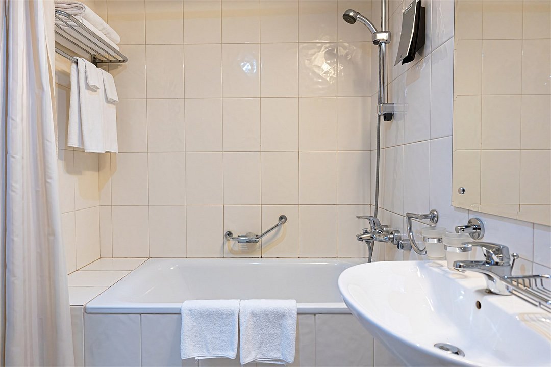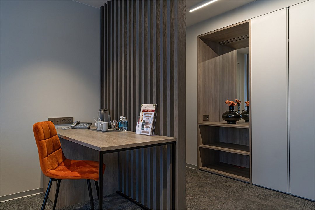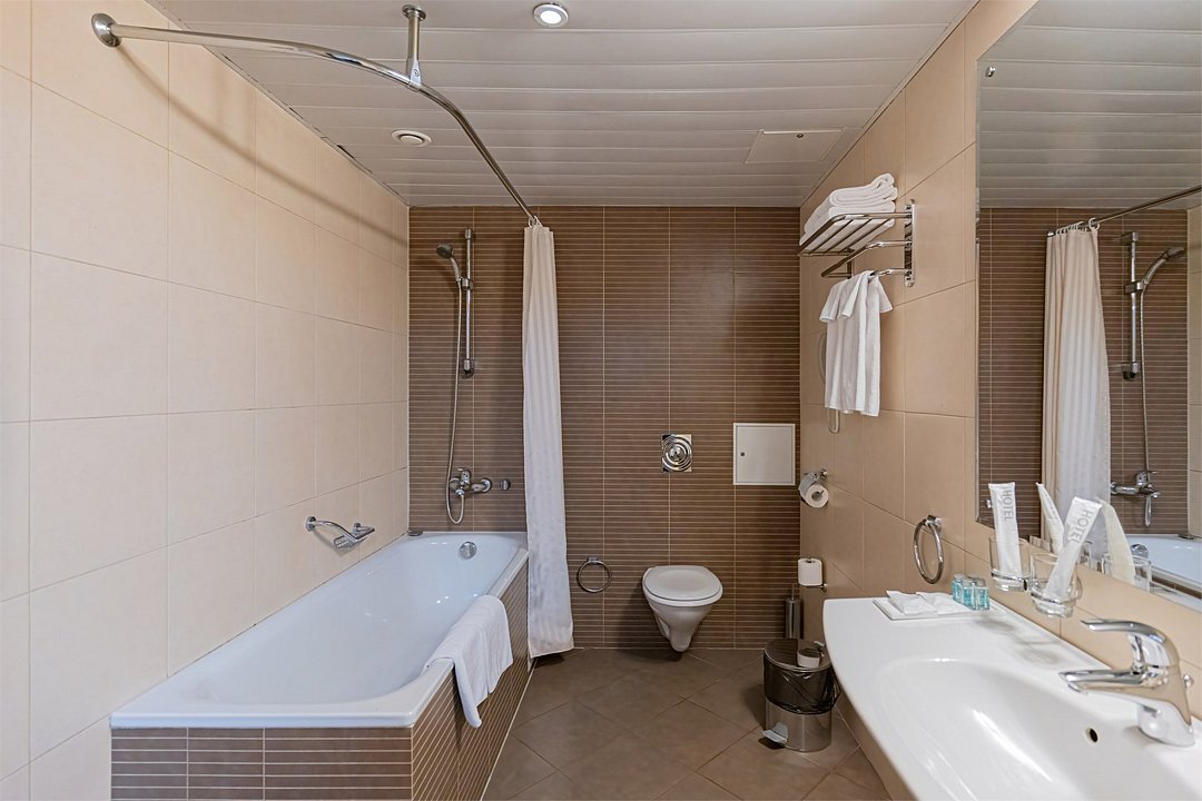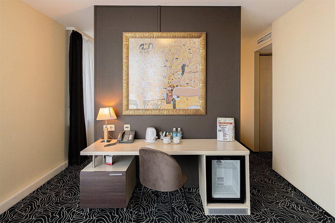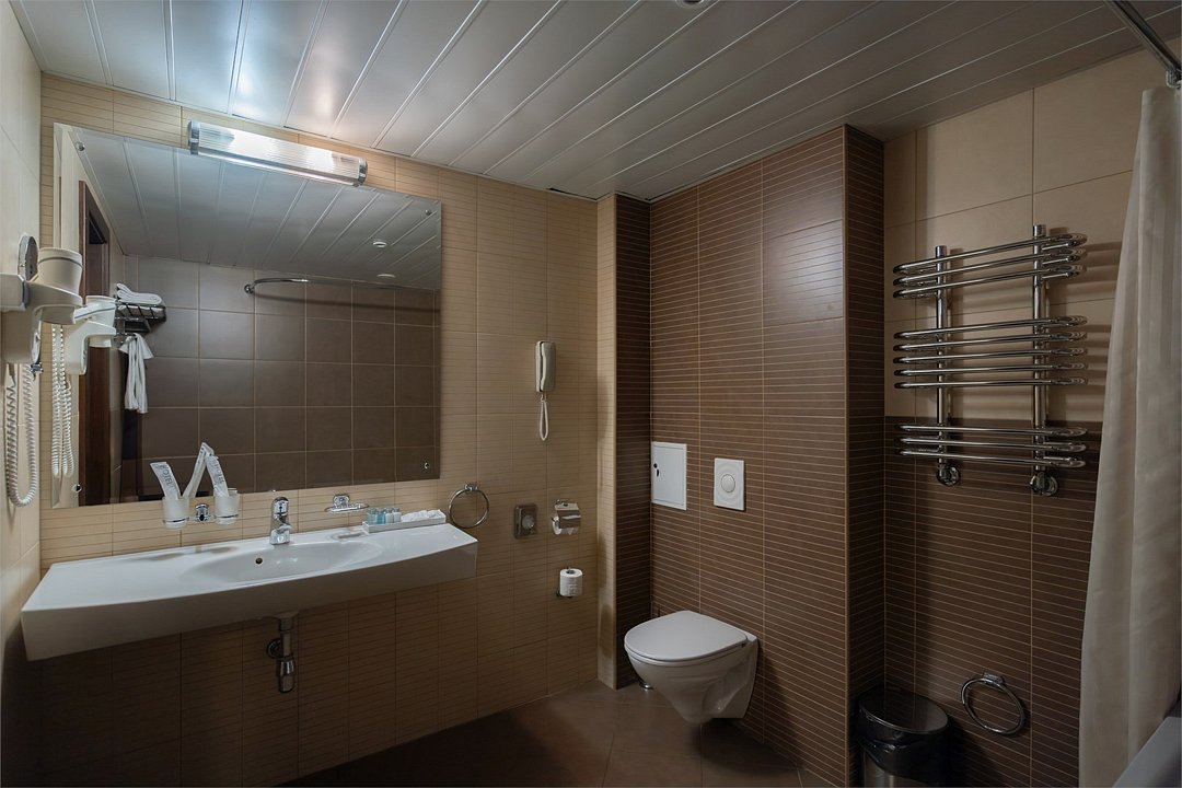 В номере 2 односпальные кровати ( при необходимости возможно соединение в одну кровать), прикроватная тумба, пуф, платяной шкаф, в некоторых номерах малый 2-х секционный шкаф, зеркало во весь рост с вешалкой для верхней одежды, сейф, охлаждающий шкаф для напитков, чайная станция, ЖК ТВ (спутниковое ТВ) , телефон, ванная, фен.Услуги и удобства