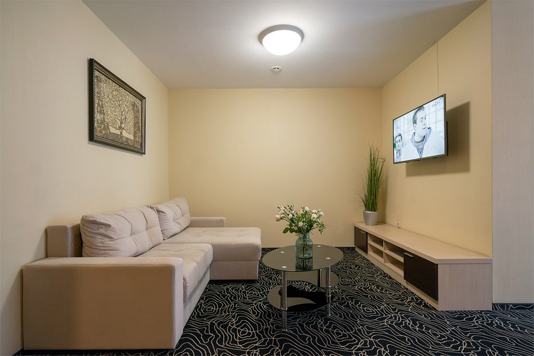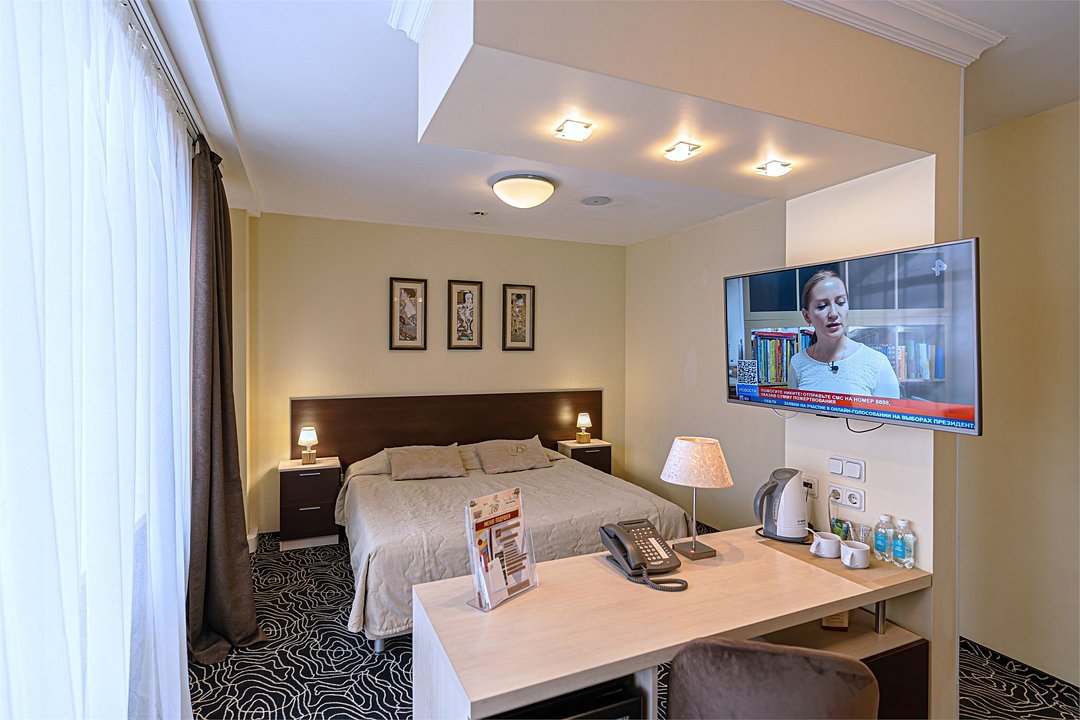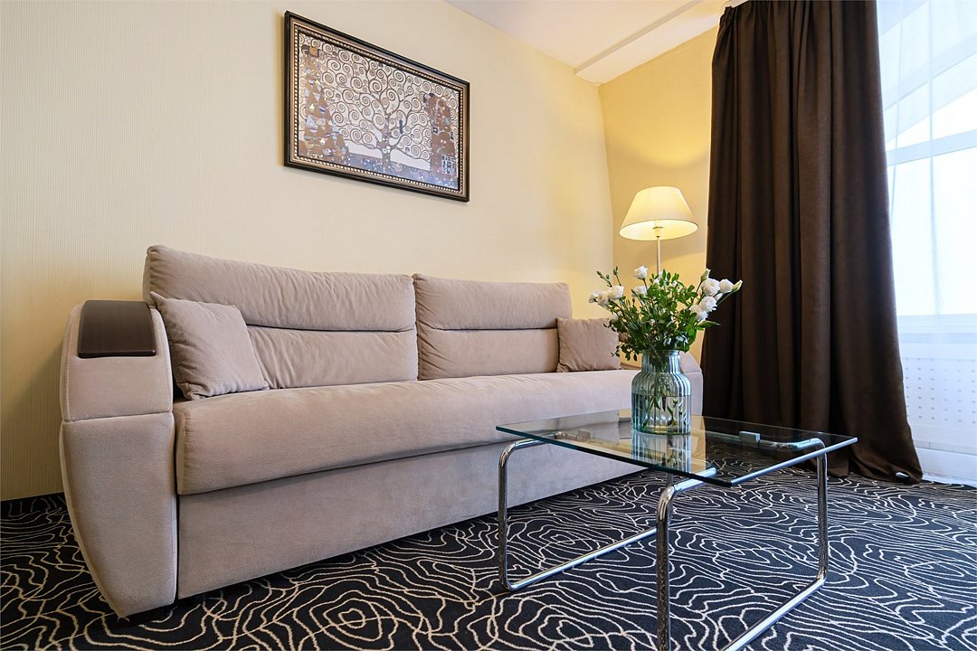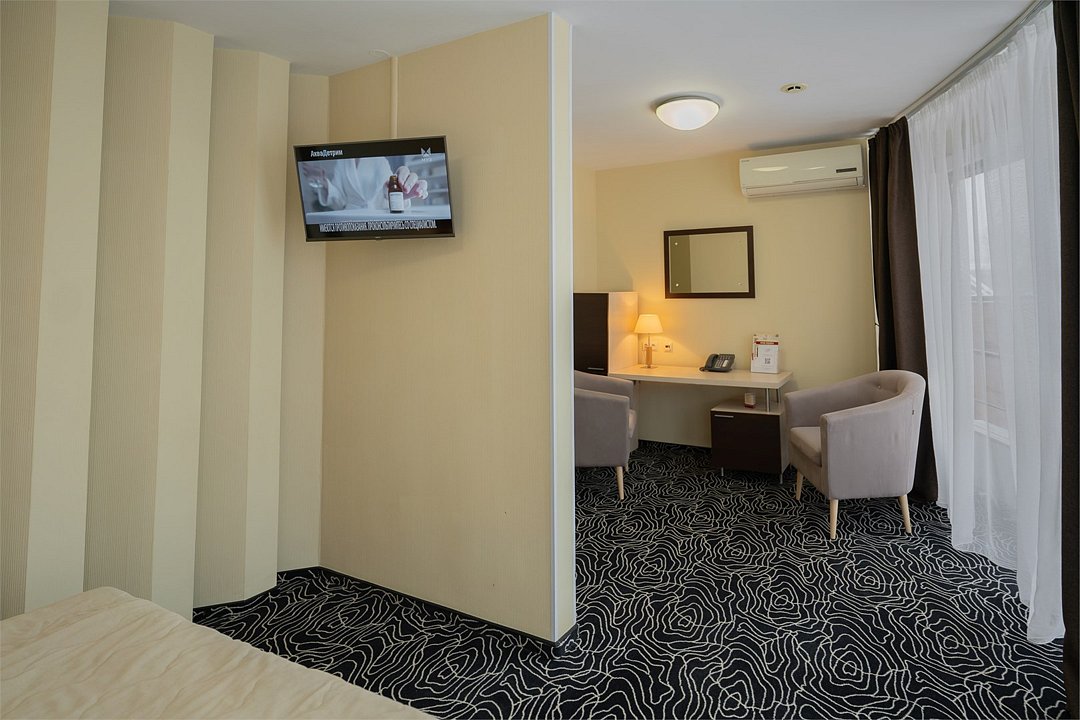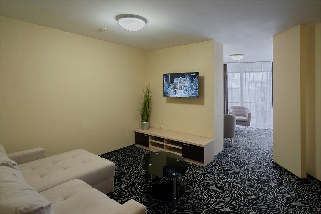 В номере одна большая двуспальная кровать, 2 тумбы, рабочий стол, стул, диван (возможно использование как дополнительного спального места), 1 кресло, низкая тумба, малое зеркало, платяной шкаф, зеркало во весь рост, вешалка для верхней одежды с подставкой под багаж, сейф, охлаждающий шкаф для напитков, чайная станция, ЖК ТВ (спутниковое ТВ), Wi-Fi, ванная, фен, телефон в ванной. Основные отличия от люкса: большая площадь, добавлено кресло, низкая тумба и зеркало в комнате. Большое панорамное окно с видом во двор. Ламинированное покрытие с ковром в зоне гостиной.Услуги и удобства