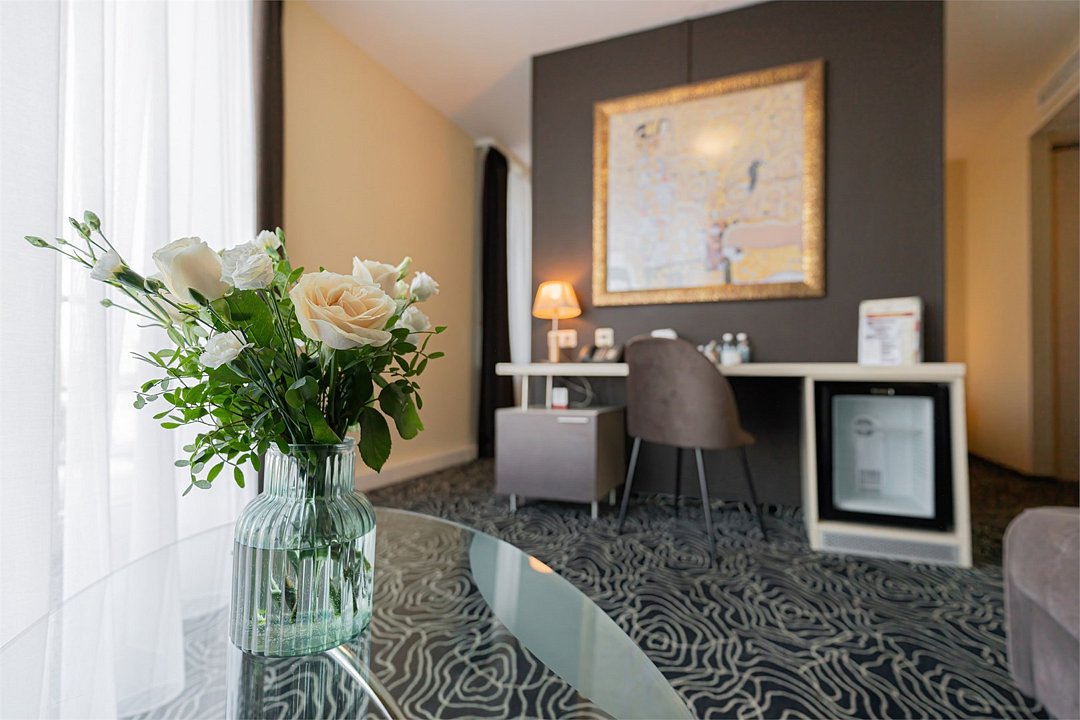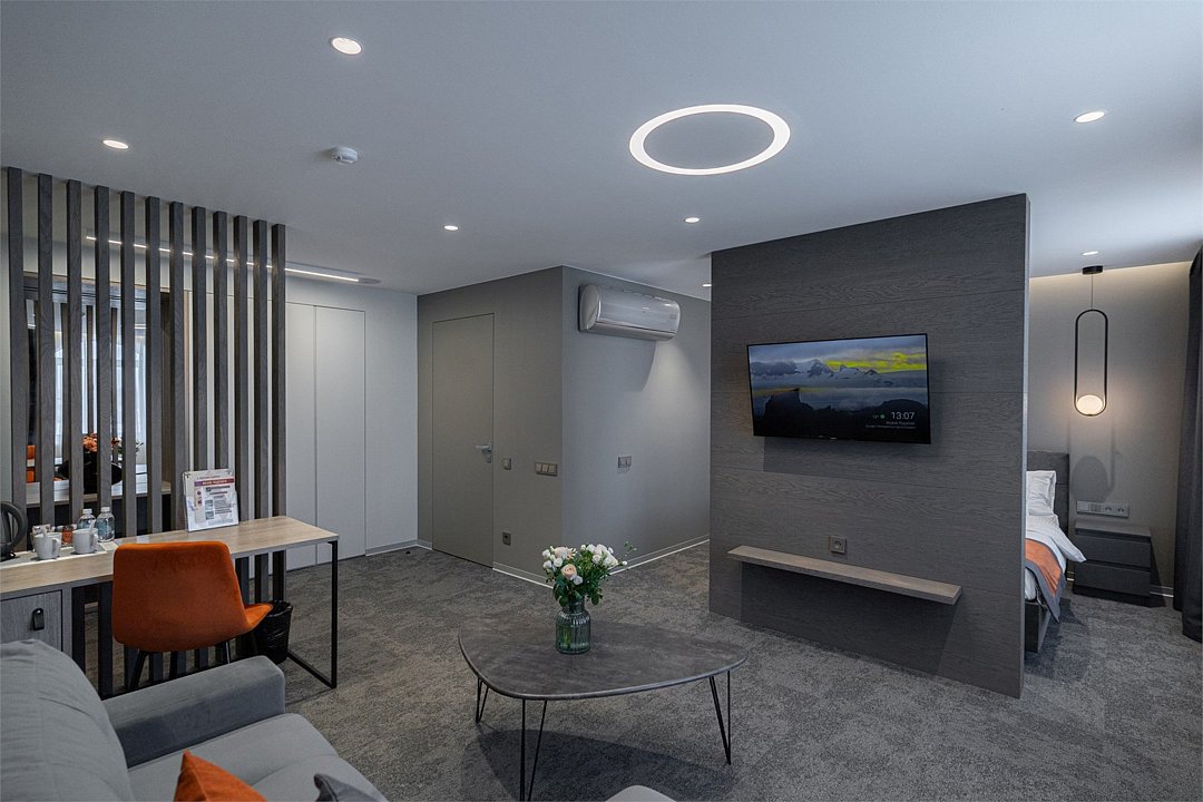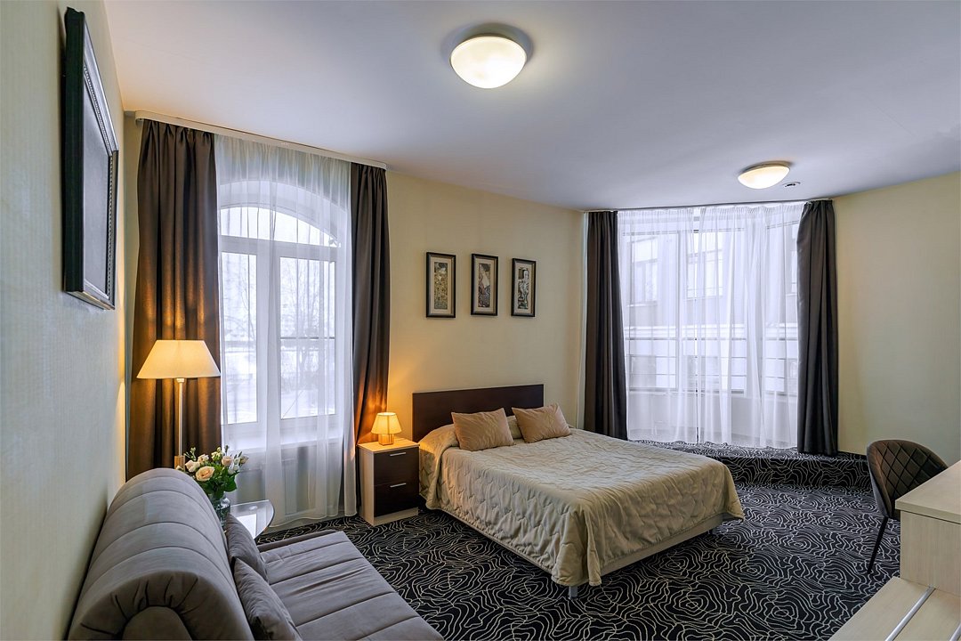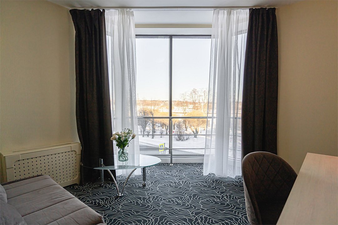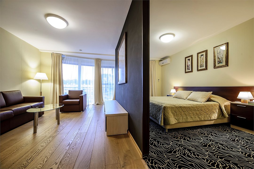 В номере одна большая двуспальная кровать, 2 тумбы, рабочий стол, стул, диван (возможно использование как дополнительного спального места), 1 кресло, низкая тумба, малое зеркало, платяной шкаф, зеркало во весь рост, вешалка для верхней одежды с подставкой под багаж, сейф, охлаждающий шкаф для напитков, чайная станция, ЖК ТВ (спутниковое ТВ), Wi-Fi, ванная, фен, телефон в ванной. Основные отличия от люкса: большая площадь, добавлено кресло, низкая тумба и зеркало в комнате. Большое панорамное окно с видом во двор. Ламинированное покрытие с ковром в зоне гостиной.Услуги и удобства