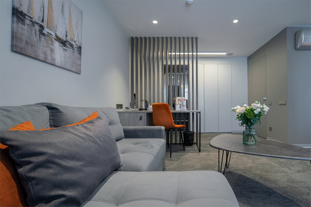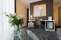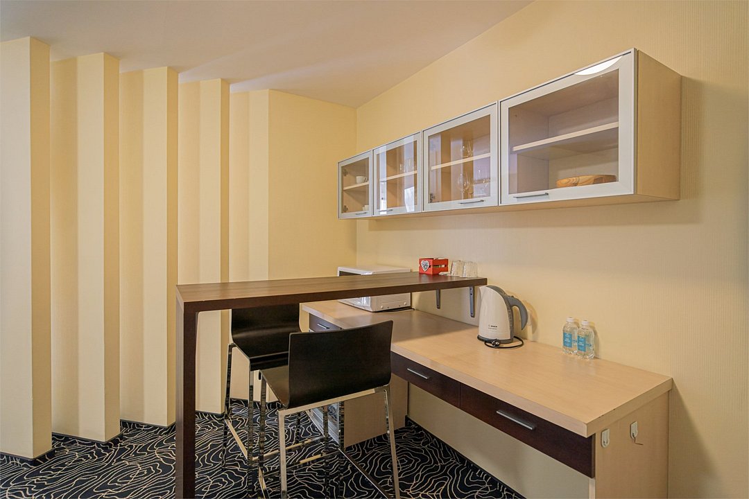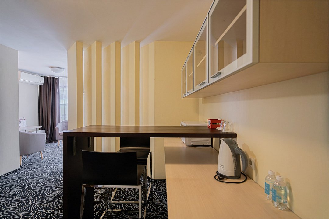 В номере 1 двуспальная кровать (160х200 см), 2 тумбы, рабочий стол, стул, малое зеркало, кресло, угловой диван (возможно использование как дополнительного спального места), низкая тумба, барная стойка с 2 стульями, кухонным гарнитуром, электрическим чайником и микроволновой печью, платяной шкаф, зеркало во весь рост, вешалка для верхней одежды с подставкой под багаж, сейф, охлаждающий шкаф для напитков, чайная станция, два ЖК ТВ см(спутниковое ТВ), Wi-Fi, ванная, фен, телефон в ванной. .Услуги и удобства