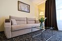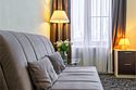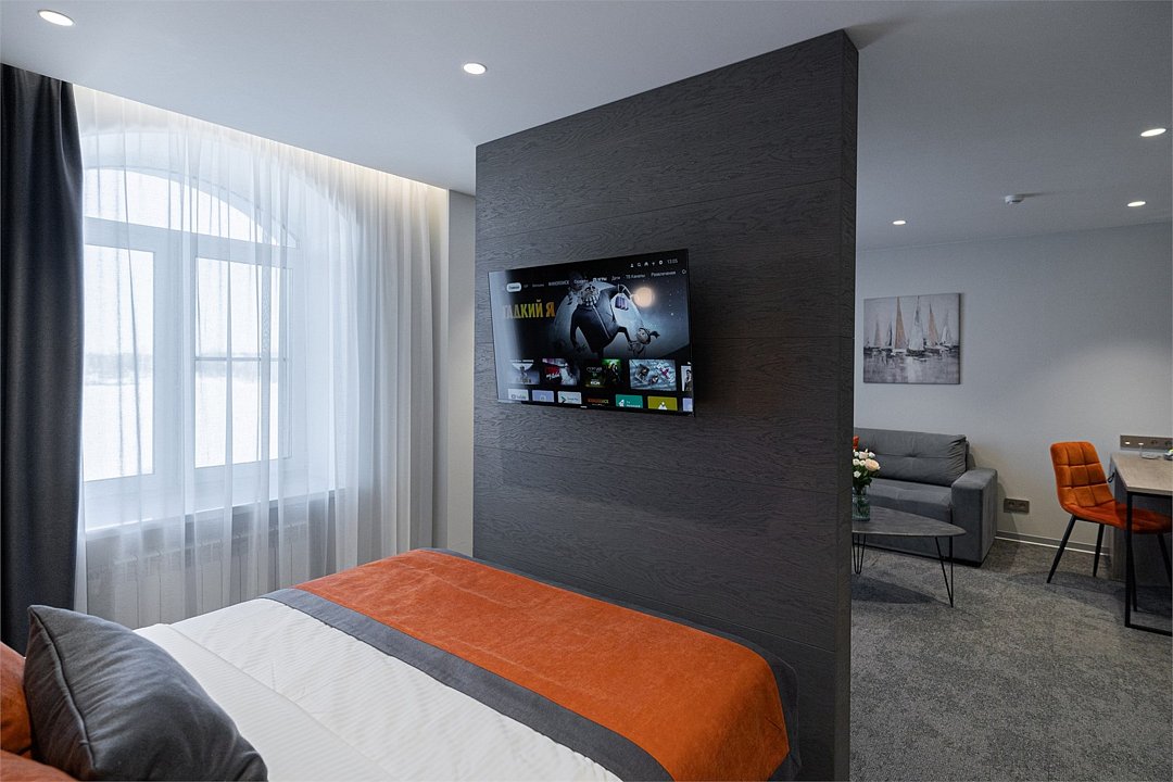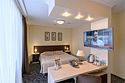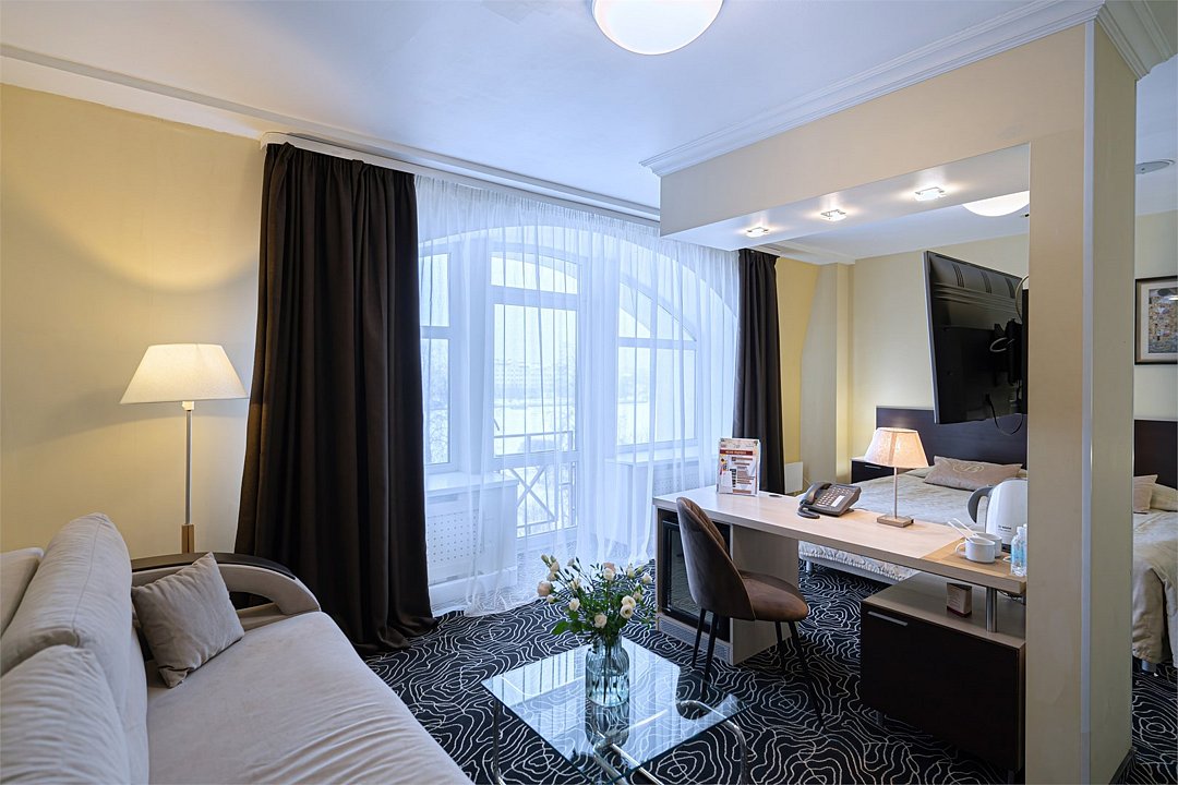 В номере 1 двуспальная кровать без возможности разъединения, 2 тумбы, рабочий стол, стул, раскладной диван, платяной шкаф, зеркало во весь рост, вешалка для верхней одежды с подставкой под багаж, сейф, охлаждающий шкаф для напитков, чайная станция, ЖК ТВ (спутниковое ТВ) , Wi-Fi, ванная, фен, телефон в ванной, биде Отличается от стандартного номера значительно большей площадью, перегородкой, создающей 2 зоны (гостиная и спальня), большей диагональю ТВ, заменой пуфа на стул, дополнительным диваном и большим санузлом. Вид только на набережную. Большое окно.Услуги и удобства