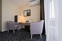 спутниковое телевидение, кабельное телевидение, Wi-Fi, телефон, кондиционер, фен, ванна, биде, банные принадлежности, халаты, банные полотенца, тапочки, двуспальная кровать, диван, тумбы, шкаф для одежды, журнальный столик, письменный стол, зеркало, мебельный гарнитур, письменные принадлежности, информационная карта, меню, сейф, гостиная зона, кулер на этаже, кресло, центральное кондиционирование, вид во двор, меню подушек, холодильный шкафВ гостиничном номере