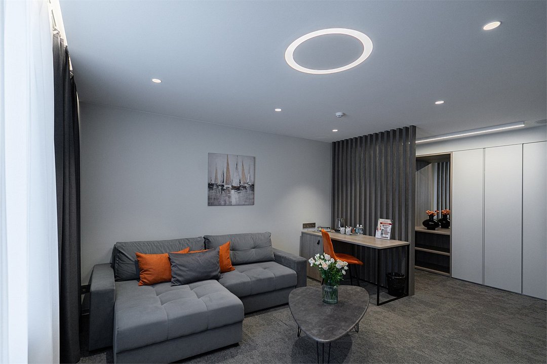 В номере 1 двуспальная кровать (160х200 см), 2 тумбы, рабочий стол, стул, диван (возможно использование как дополнительного спального места), платяной шкаф, зеркало во весь рост, вешалка для верхней одежды с подставкой под багаж, сейф, охлаждающий шкаф для напитков, чайная станция, ЖК ТВ (спутниковое ТВ), Wi-Fi, ванная, фен, телефон в ванной. Основные отличия от полулюкса: больше прихожая и более уютная планировка, вид только на набережную.Услуги и удобства