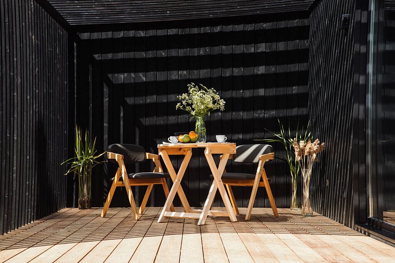 В доме есть комфортная двуспальная кровать, кухонная и обеденная зоны и современный санузел с необходимыми туалетными принадлежностями и полотенцами, а на террасе шезлонги и зона для барбекю.