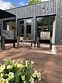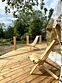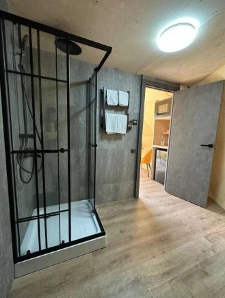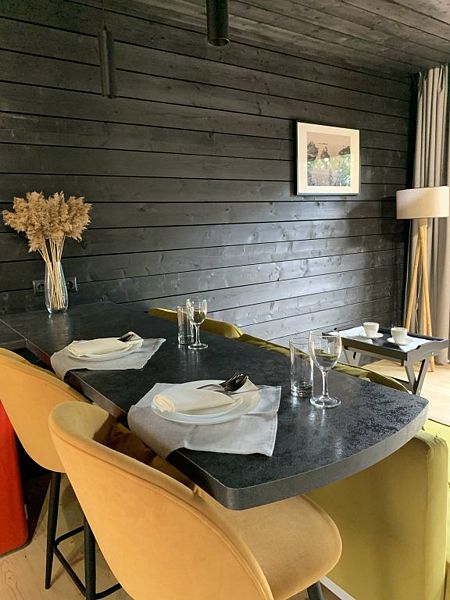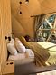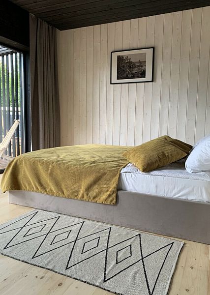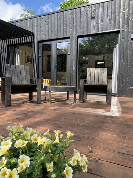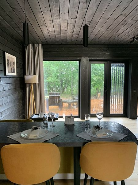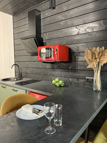 В доме есть комфортная двуспальная кровать, кухня с плитой, двухместный диван в обеденной зоне и современный санузел с необходимыми туалетными принадлежностями и полотенцами, а на террасе шезлонги и зона для барбекю.