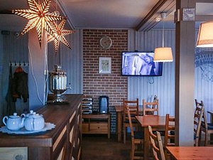 На первом этаже основного корпуса расположена кухня-столовая. В течение дня гости, расположенных в корпусе номеров, могут воспользоваться ей и приготовить еду: кухня оборудована двумя электроплитами, духовкой, посудомоечной машиной, холодильником, посудой для сервировки и готовки. В столовой есть терраса с видом на Вуоксу. Летом здесь особенно приятно организовать себе завтрак и полюбоваться природой.