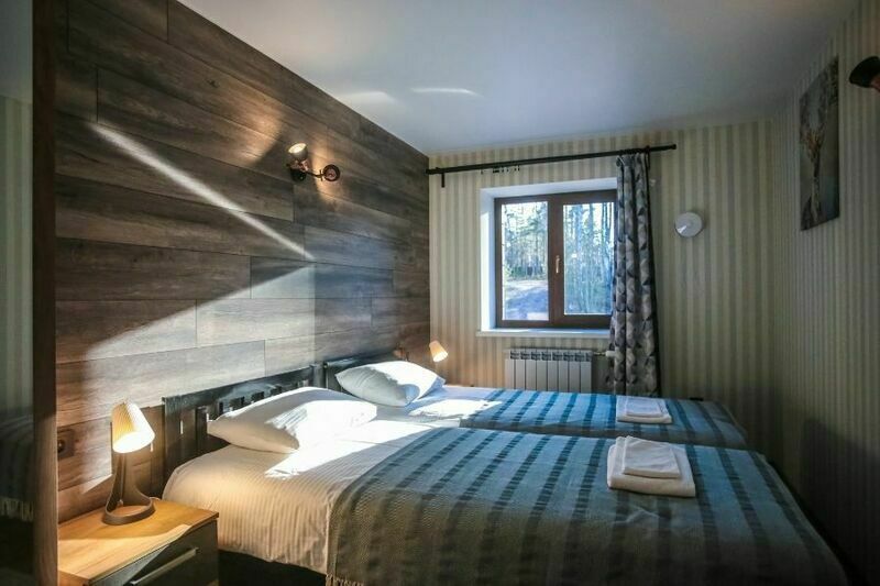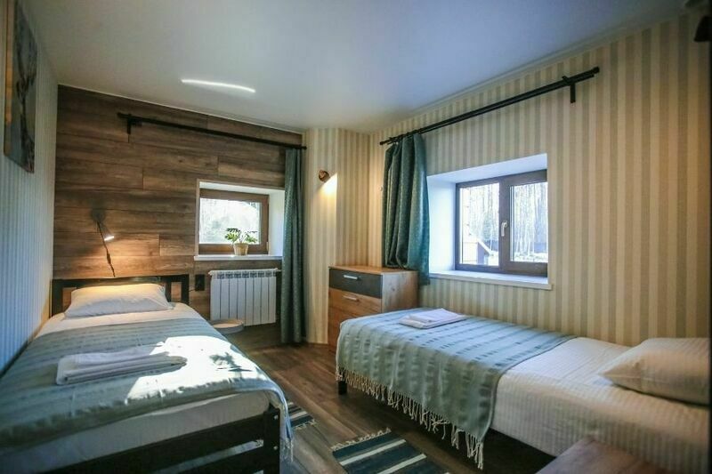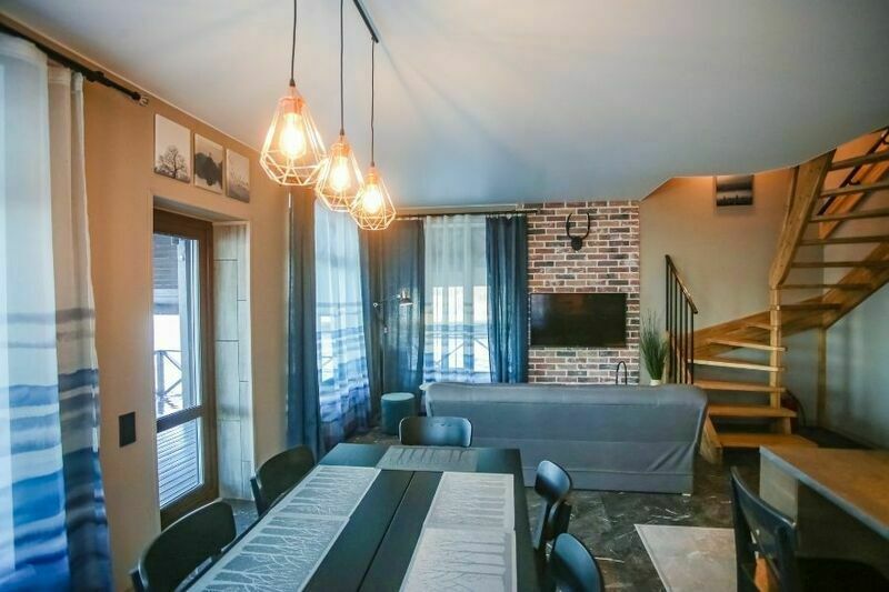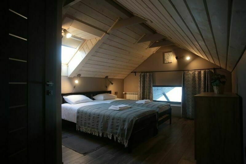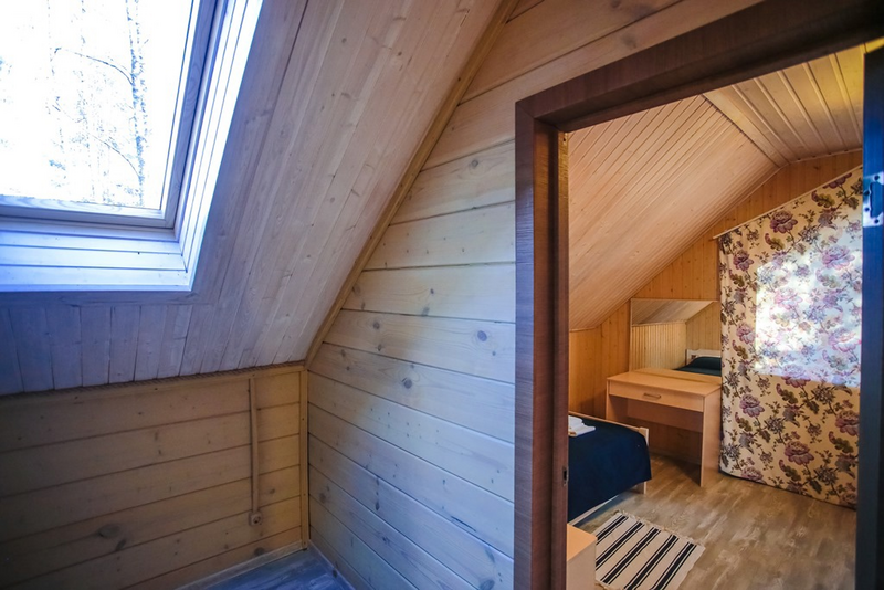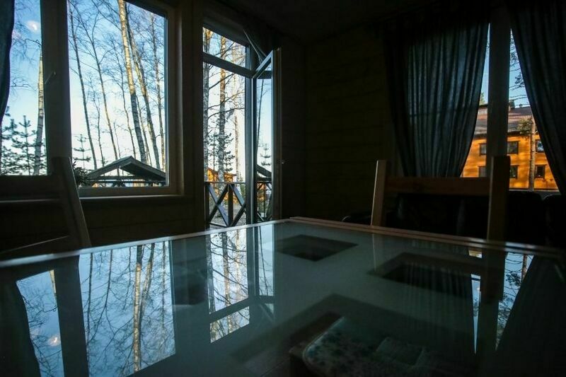 В дуплексе имеется небольшая гостиная-столовая на первом этаже, которая оборудована кухней и всем необходимым. На втором этаже находятся две спальни с раздельными кроватями. Из гостиной есть выход на небольшую террасу, где есть стол и стулья, а летом можно организовать завтрак с видом на лес. Прямо рядом с коттеджем, где расположен Дуплекс, есть своя беседка с мангалом. Для удобства всех гостей в дуплексе есть 2 санузла с тёплым полом.