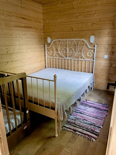Дом состоит из кухни-гостиной с двухместным диваном и комнаты ( спальня) с двухместной кроватью + кроватка для малыша . Есть мансардный этаж, где могут расположиться 2 человека.