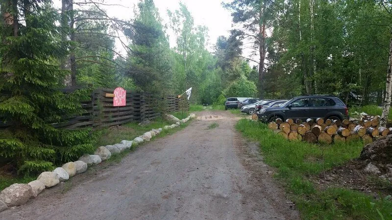 Двигаясь по Выборгскому шоссе (трасса Скандинавия) перед столбиком дорожных указателей километража на 99 км необходимо повернуть налево и далее 6 км по лесной дороге. Придерживаясь красных указателей.