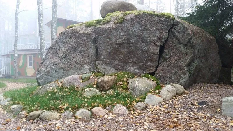 Двигаясь по Выборгскому шоссе (трасса Скандинавия) за столбиком дорожных указателей километража на 110 км необходимо повернуть направо и далее 6 км по лесной дороге. Придерживаясь красных указателей.
