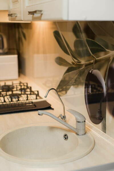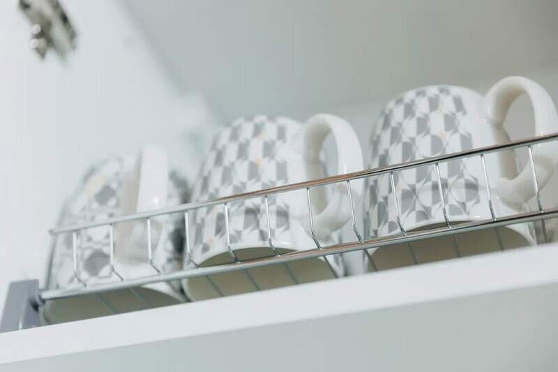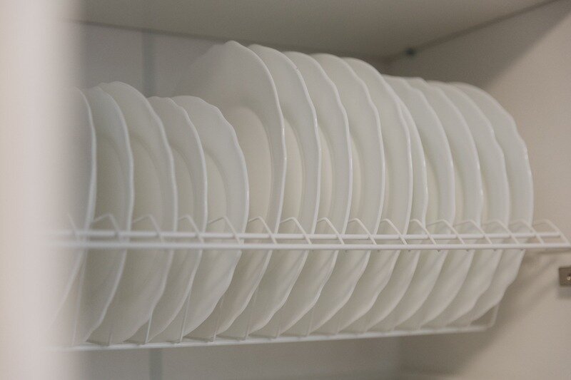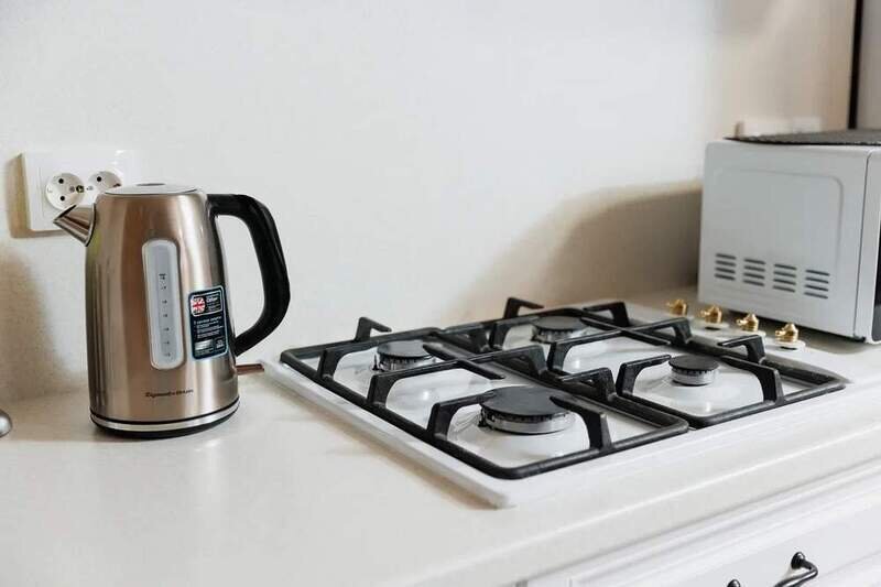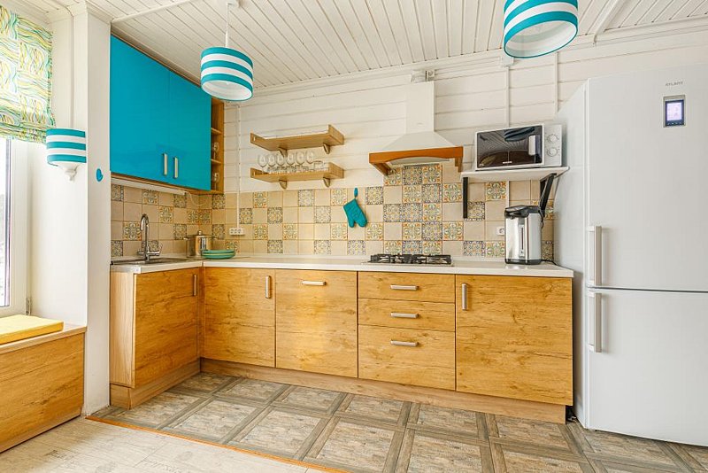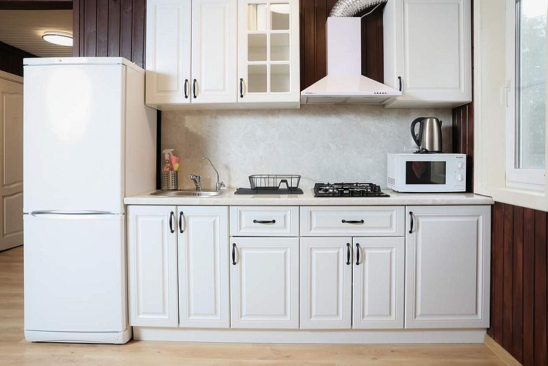 Кухня со всем необходимым (холодильник, чайник, микроволновка, посуда, фильтр с