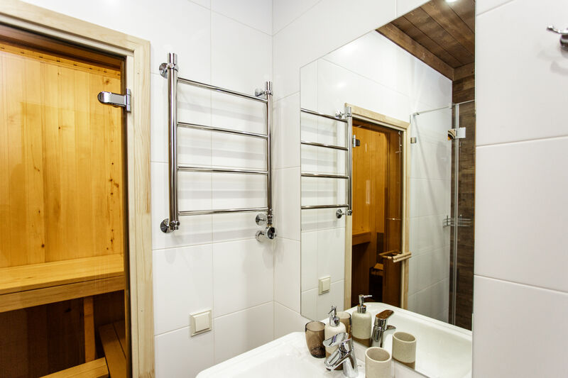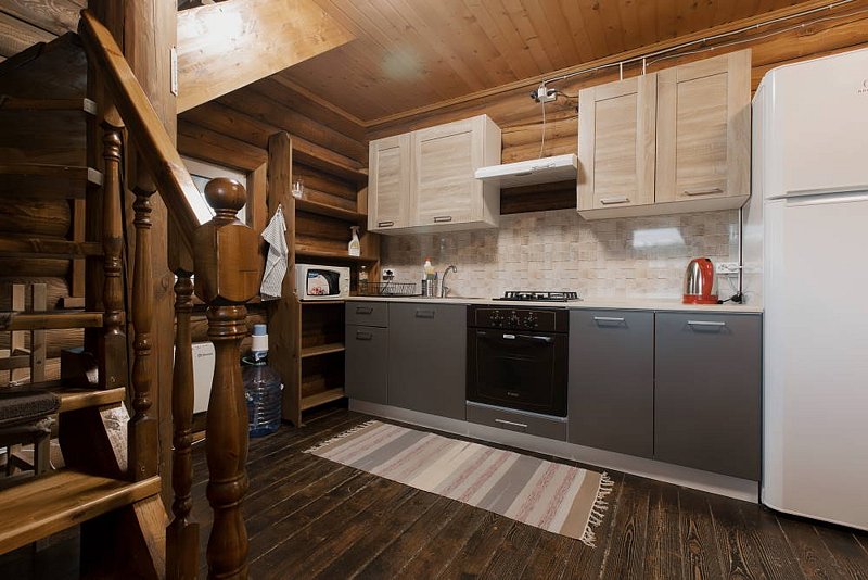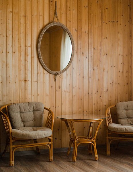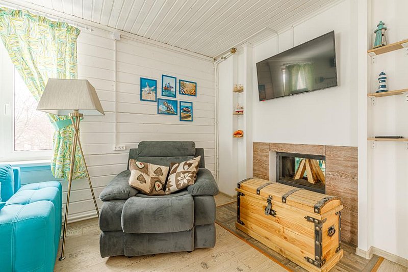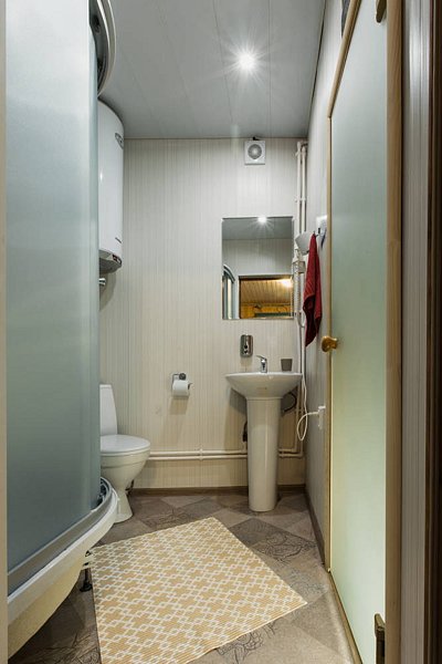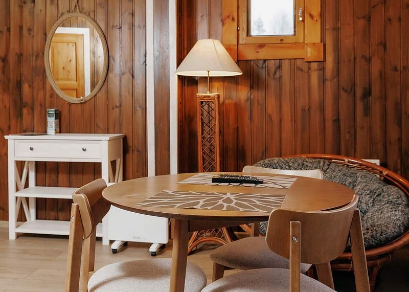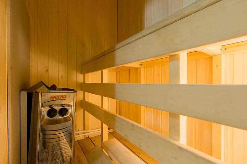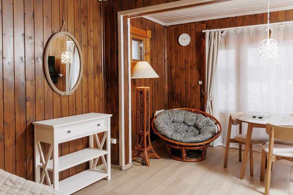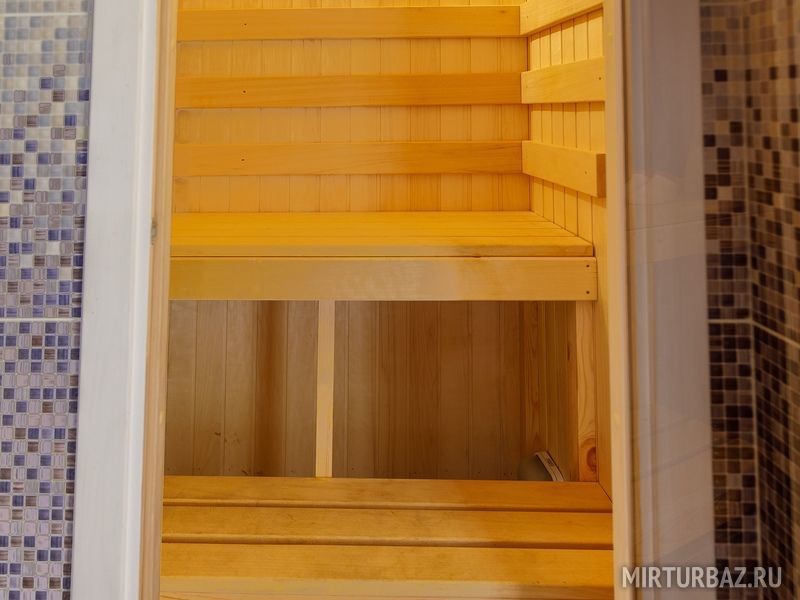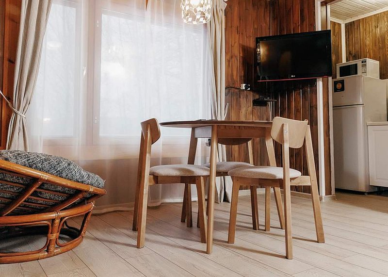 рабочей зоной, холодильником и сауной (сауна входит в стоимость проживания). Из многочисленных окон в номере открывается