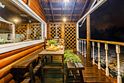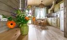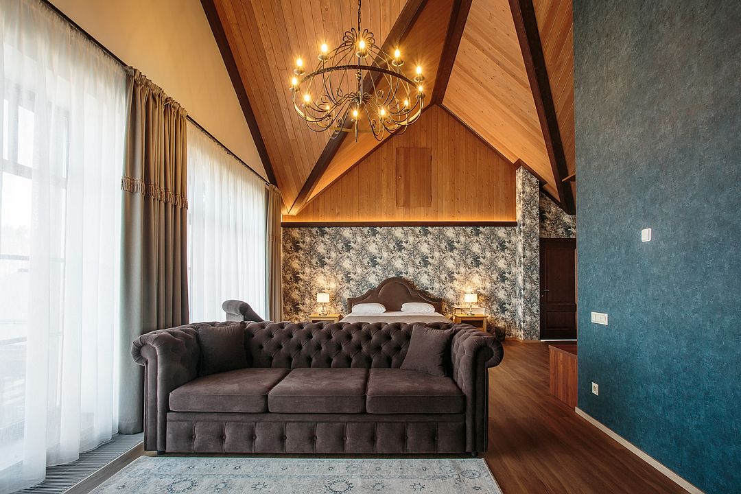 Теплая цветовая гамма, высокие деревянные потолки и дизайнерская мебель создают