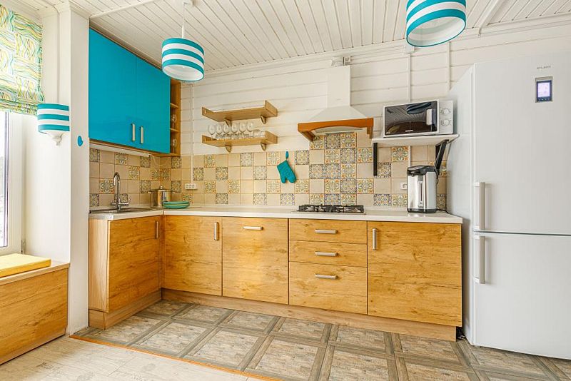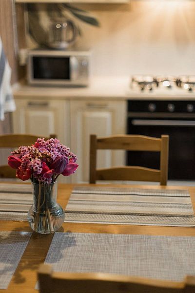 Кухня (холодильник, электрическая плита, микроволновка, чайник, посуда, обеденный стол,