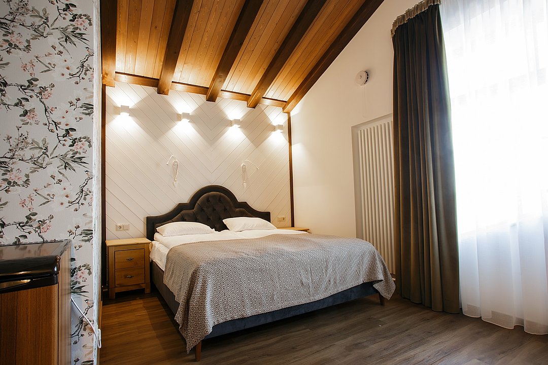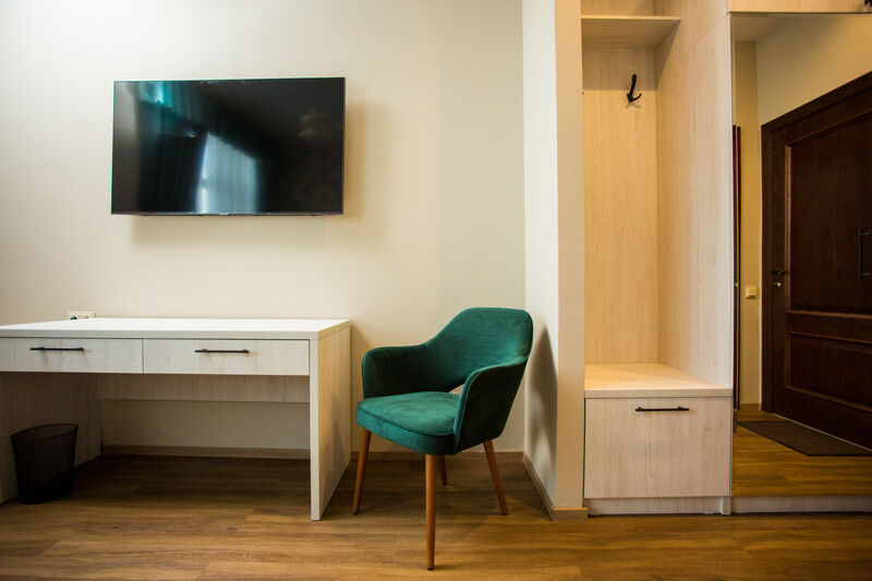 В номере имеется большая удобная кровать, рабочий стол, шкаф, телевизор и мини-холодильник.