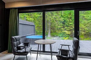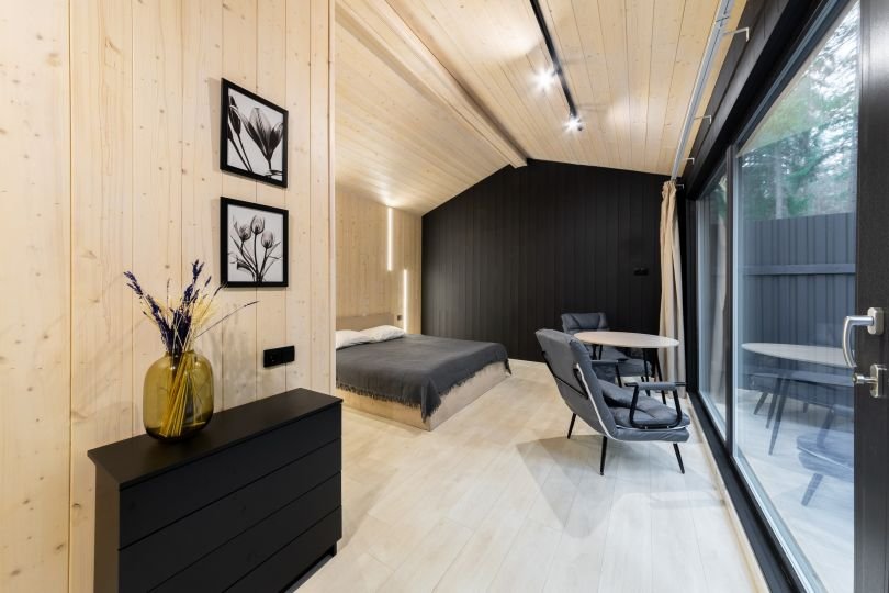 Уютные коттеджи с панорамными окнами позволяют вдоволь насладиться открывающимся видом в любое время года.