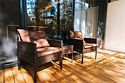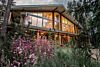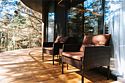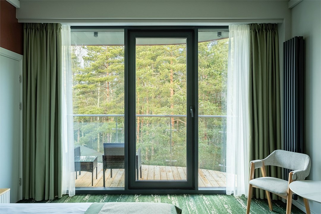 Из панорамных окон от пола до высокого потолка открывается невероятно красивый вид на вечнозеленый лес.
