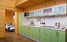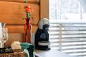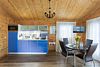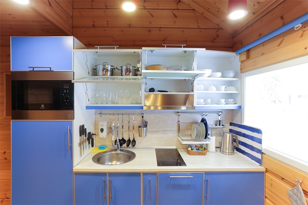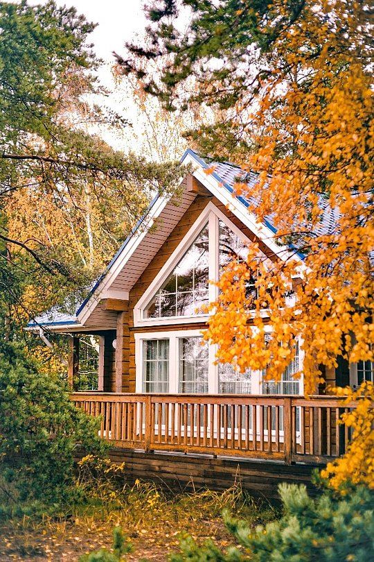Первое, что бросается в глаза — как здесь светло и просторно. Панорамные окна выходят в лес, а в большой гостиной хватит места, чтобы поставить детскую кроватку или разместить дополнительные спальные места на раскладывающемся диване.