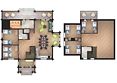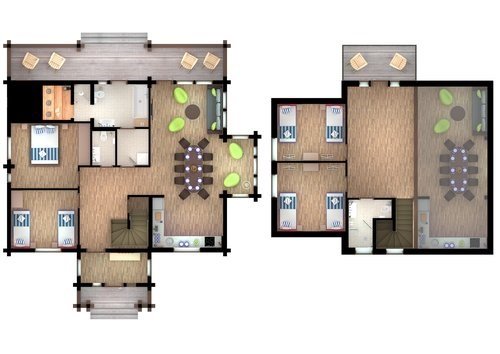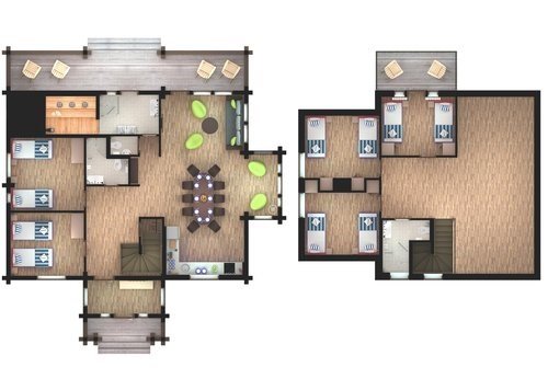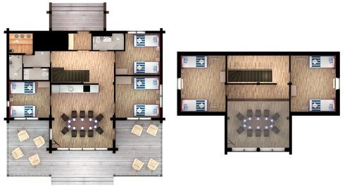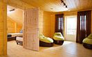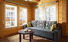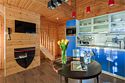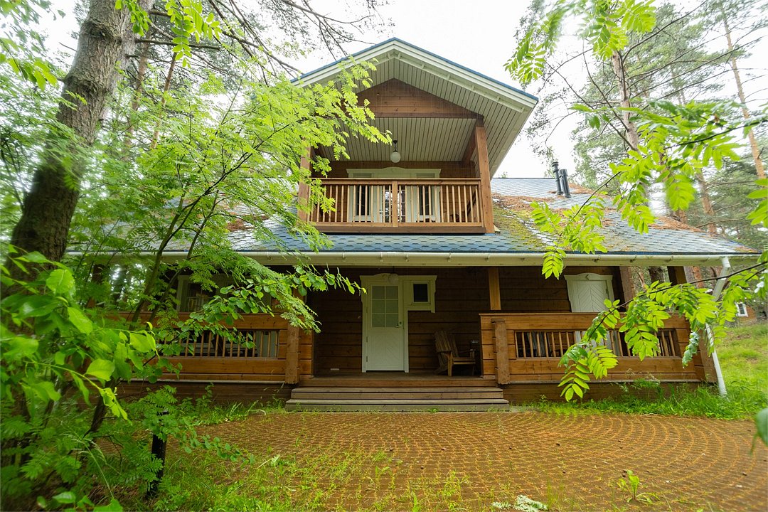 Две спальни расположены на первом этаже, ещё две — на втором. Диван в зоне отдыха тоже можно использовать как спальное место на двоих. В этом доме сауна, отдельная комната-прачечная и зона отдыха с выходом на балкон на втором этаже.